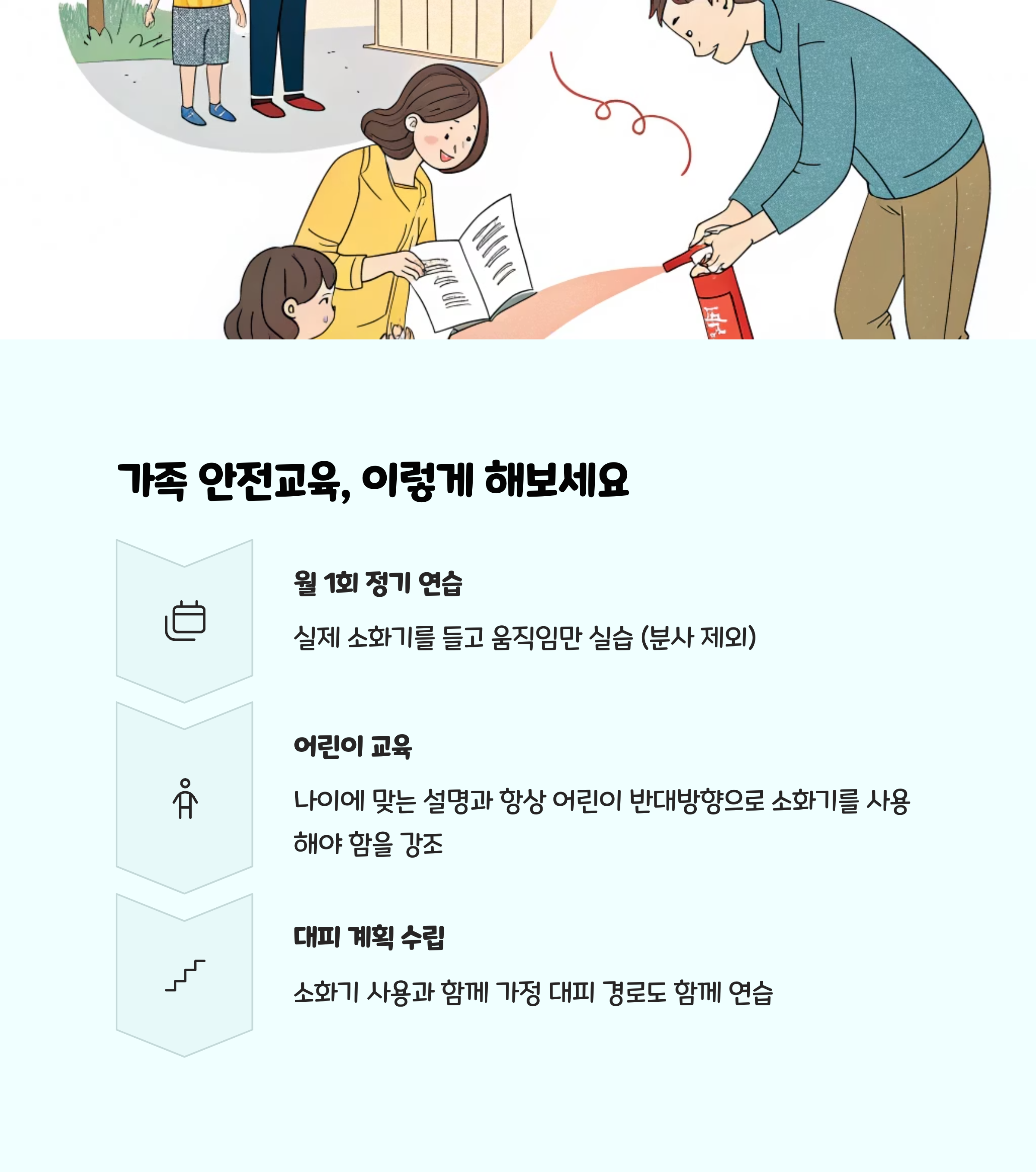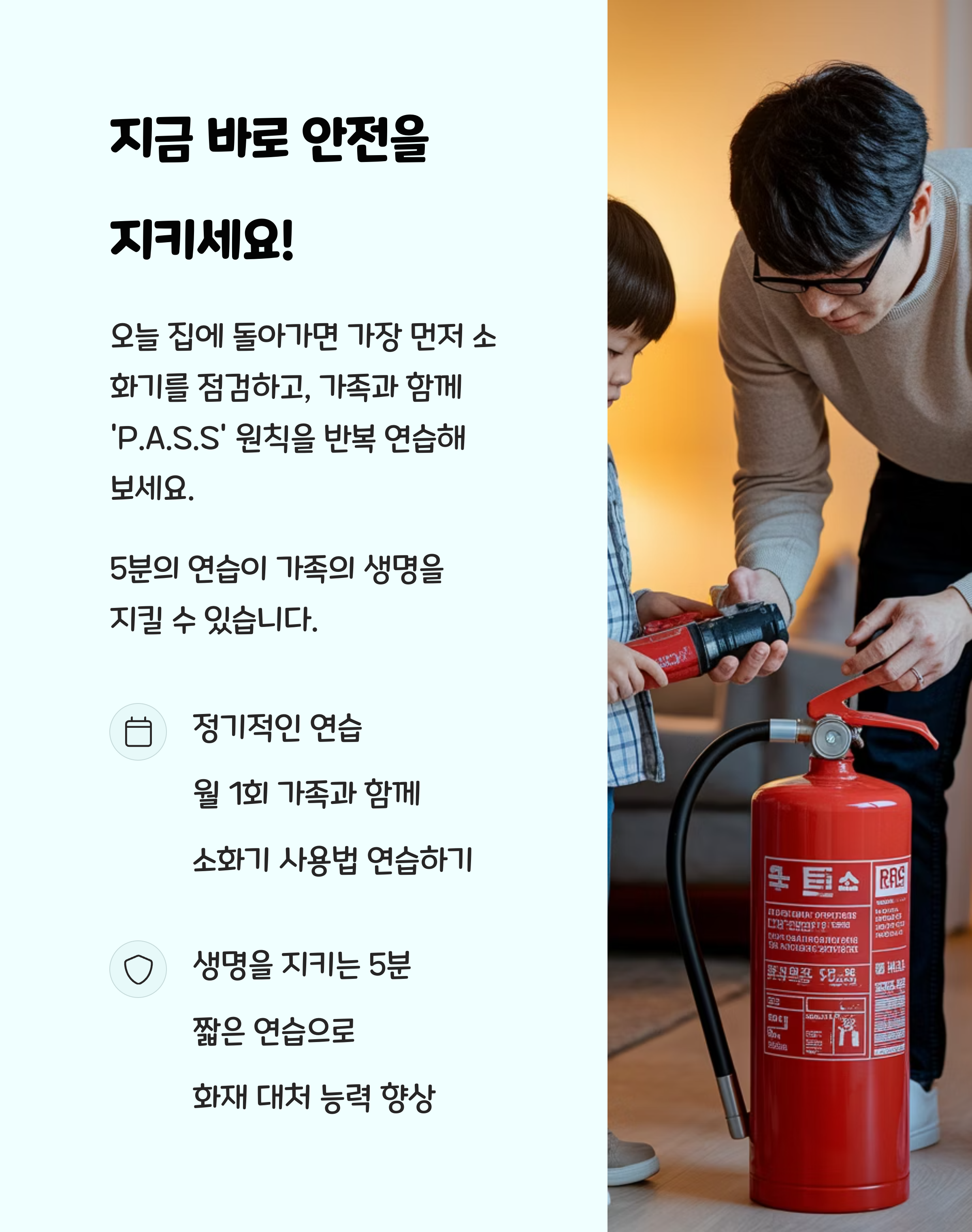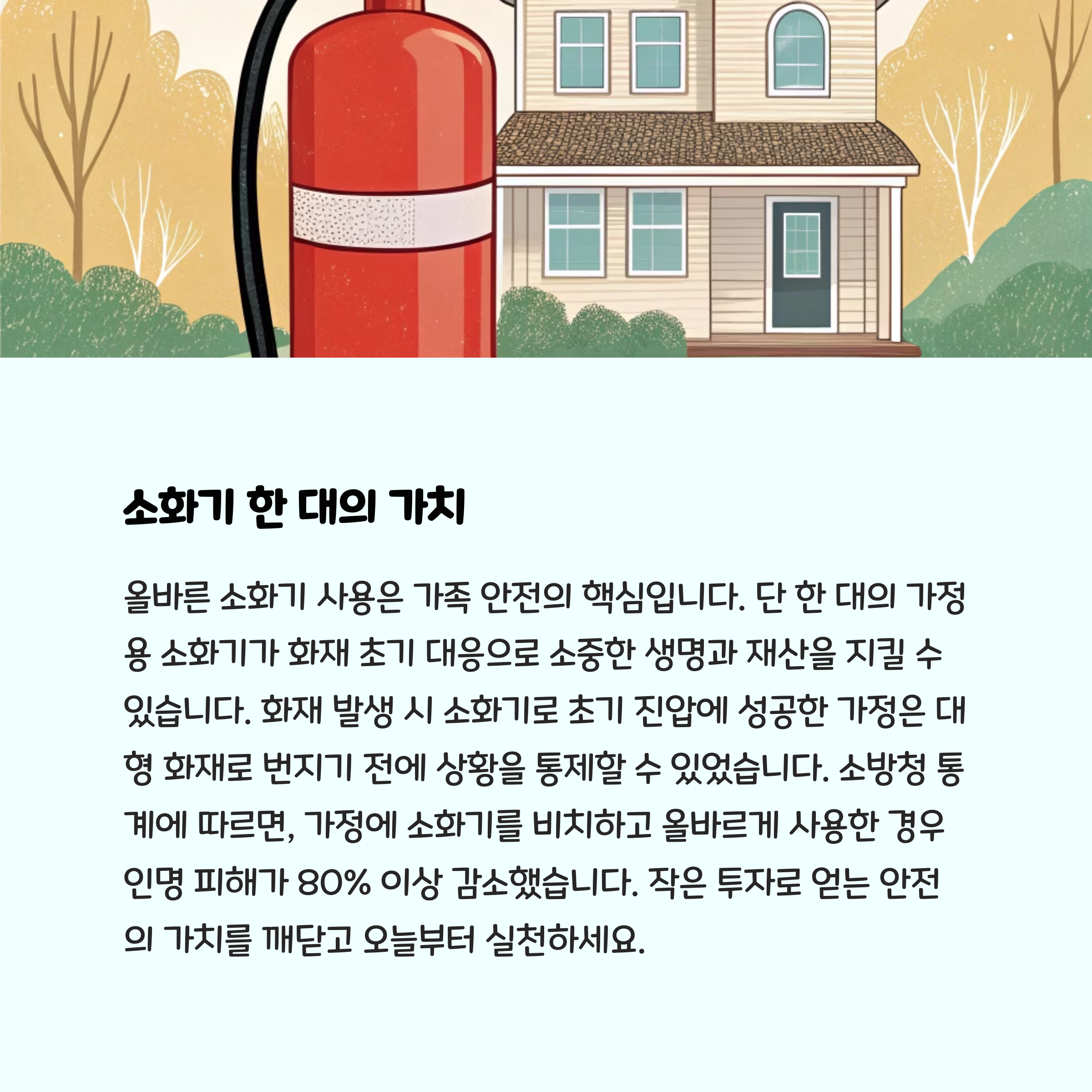 화재는 생각보다 가까이에 있고, 초기 5분이 모든 것을 좌우합니다. 집집마다 소화기를 구비하고, 가족 모두가 사용법을 익혀두면 위급 상황에서도 침착하게 대처할 수 있습니다. 오늘 당장 소화기 위치와 상태를 점검하고, 사용법을 가족과 함께 연습해 보세요. 이것이 우리 가족과 이웃의 안전을 지키는 가장 확실한 방법입니다.