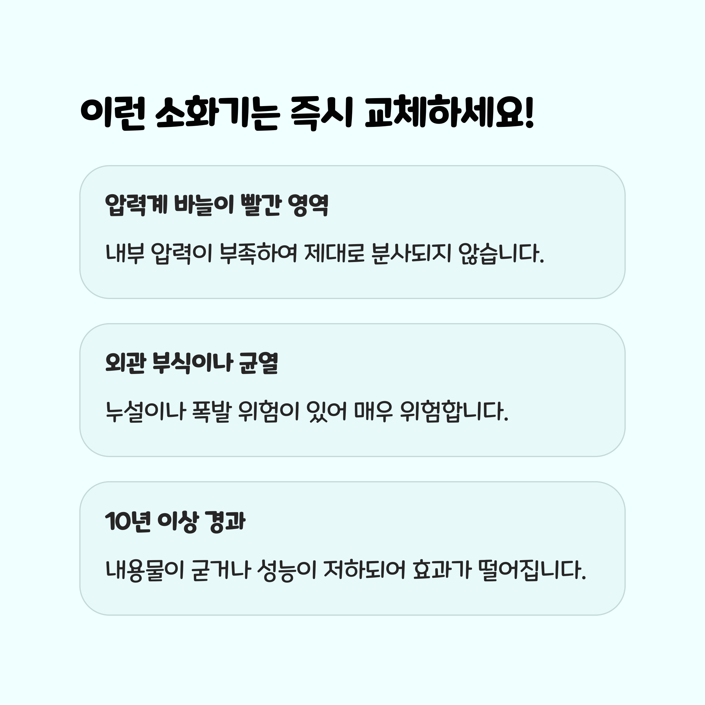 유효기간이 지난 소화기는 내부 압력이 떨어지거나 분말이 굳어서 작동하지 않을 수 있습니다. 제조일자와 압력계를 수시로 확인하고, 이상이 있으면 즉시 교체하세요.