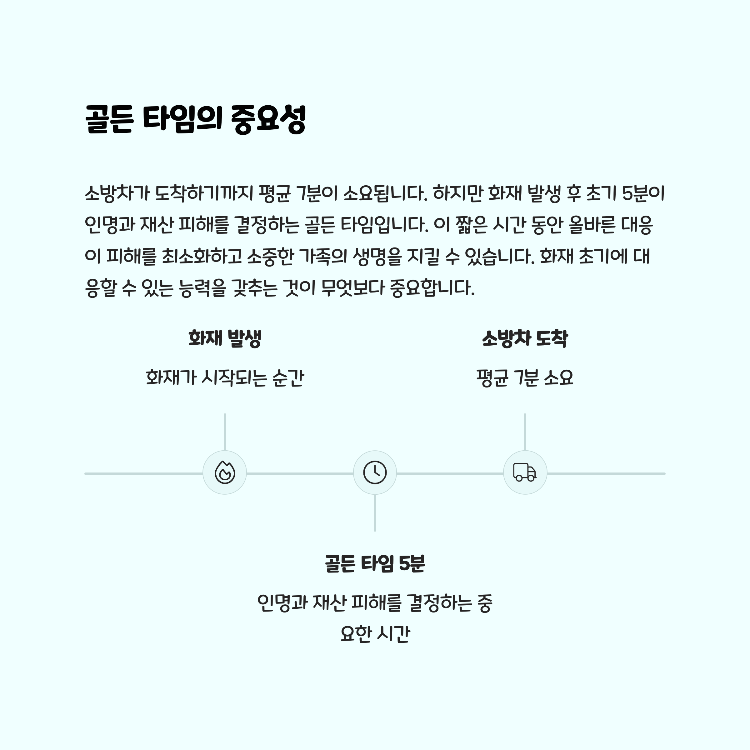 화재는 예고 없이 찾아오며, 불길은 1~2분 만에 걷잡을 수 없이 커집니다. 소방청 통계에 따르면, 화재 발생 후 5분 이내에 초기 진압에 성공하면 피해 규모가 90% 이상 감소합니다. 반면, 소화기 사용법을 몰라 우왕좌왕하다가 진압에 실패하면, 소방차가 도착할 때까지 화재가 크게 번질 위험이 높습니다.