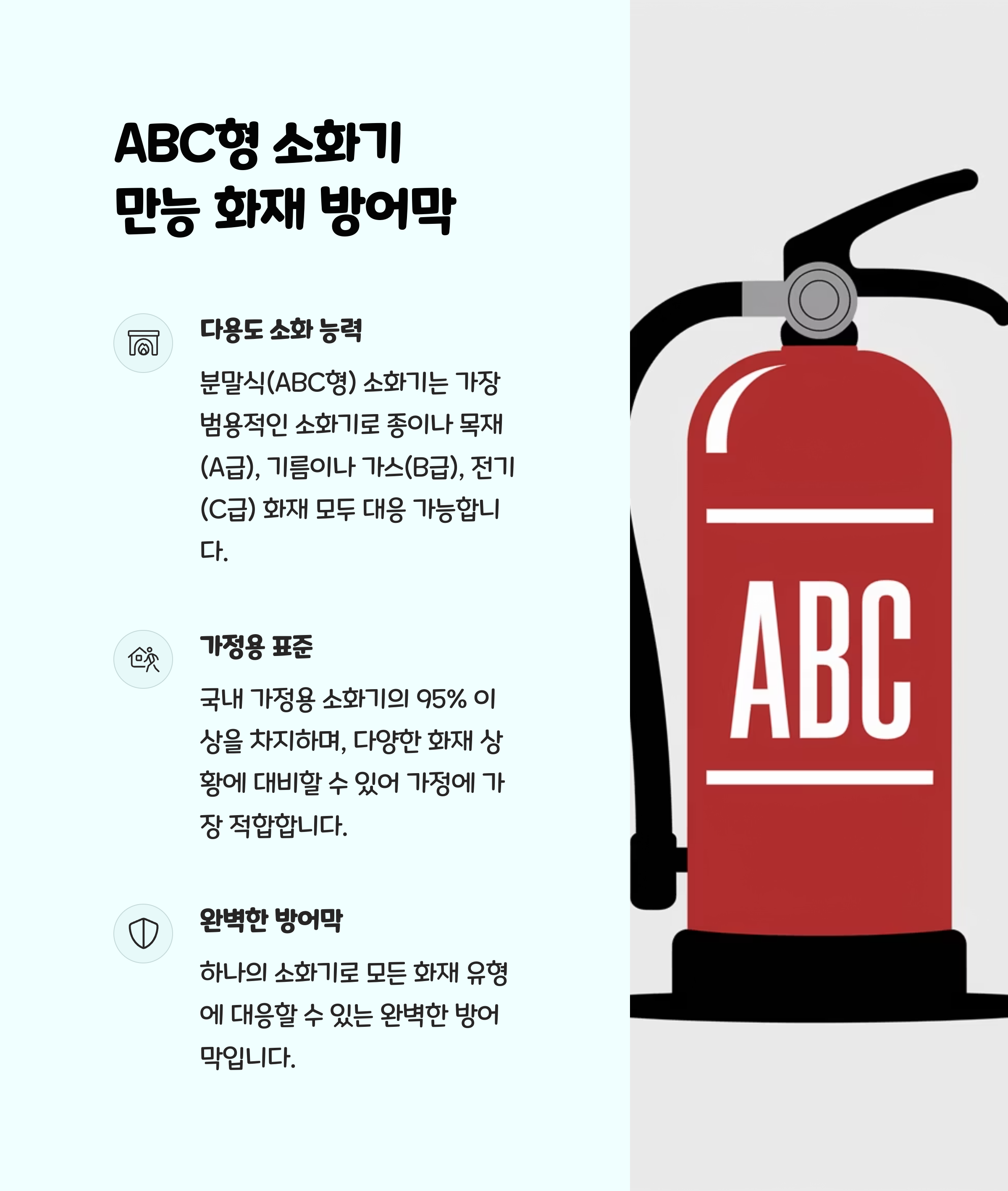 | 분말식(ABC형) | 모든 화재에 사용 가능, 가정용 표준 |