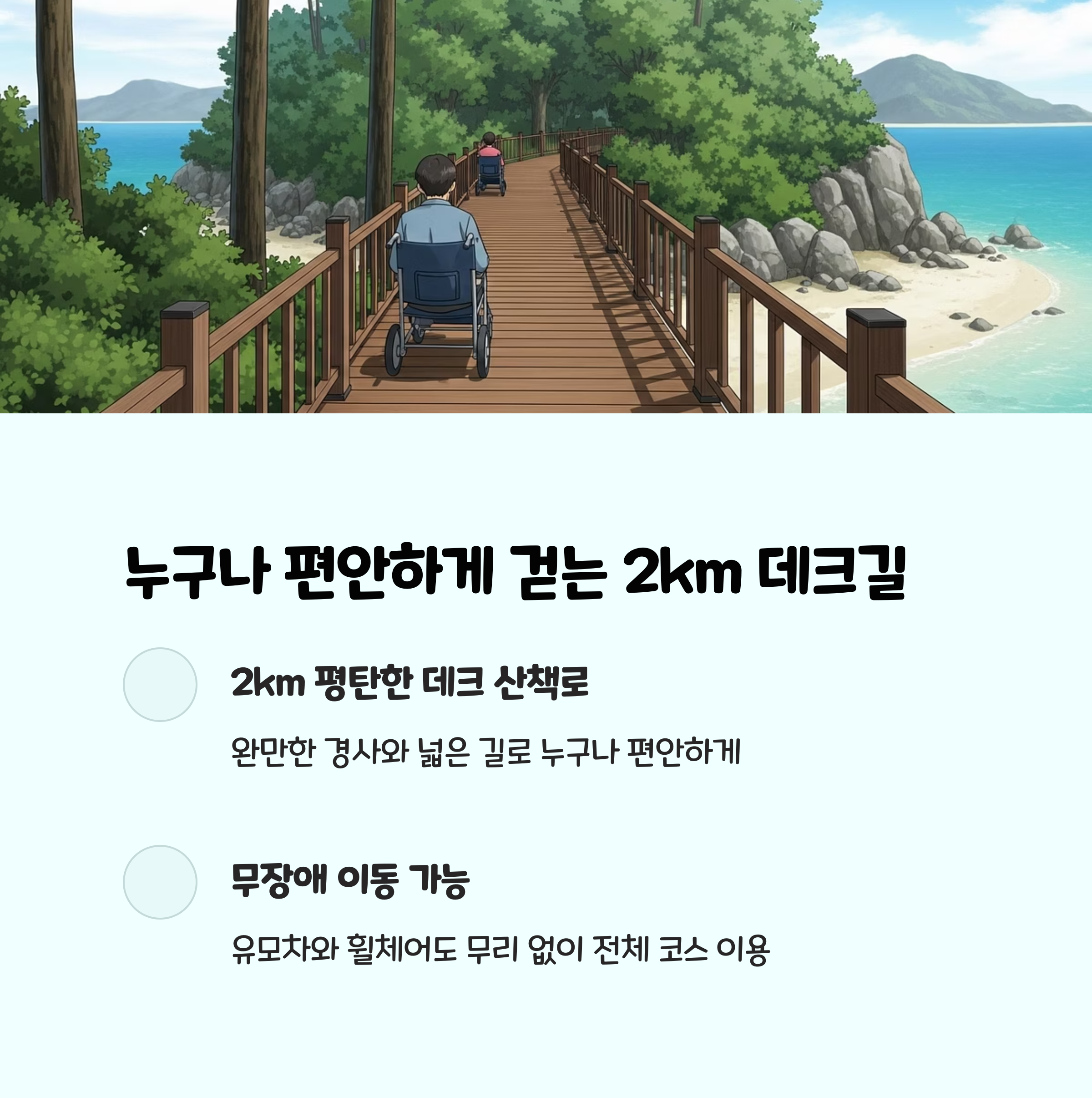길 대부분이 평탄한 데크 또는 흙길(보행 편의도 우수)로 되어 있고, 특별한 등산 장비 없이도 유모차와 휠체어 모두 이동 가능해 전 연령층이 걱정 없이 방문할 수 있습니다.
