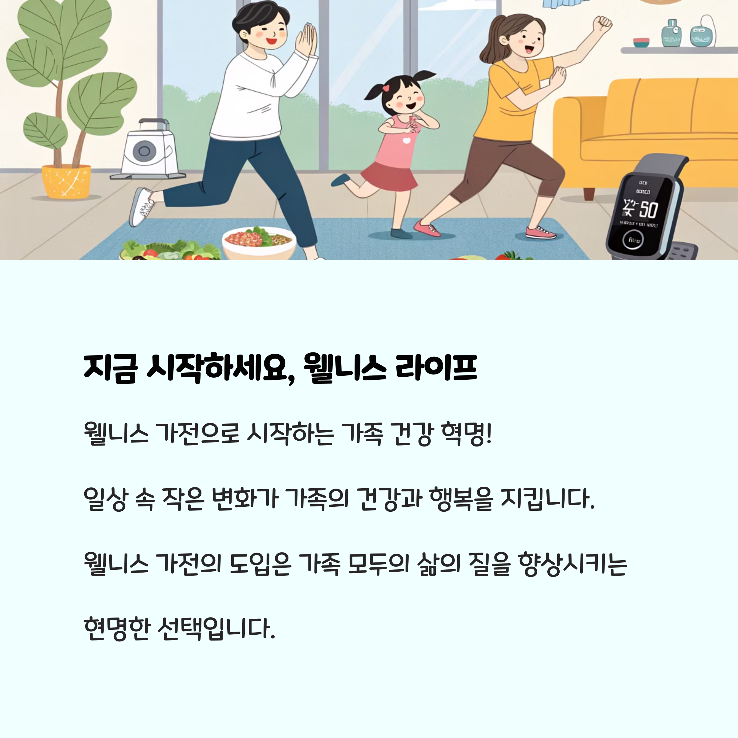 웰니스 가전제품은 단순한 편의성을 넘어 가족 모두의 건강, 위생, 심리적 만족까지 책임지는 필수 아이템으로 자리잡았습니다. AI와 IoT, 친환경 트렌드까지 더해진 스마트 가전의 현명한 선택과 활용으로, 집안에서 건강한 일상을 만들어보세요. 작은 변화가 가족의 삶 전체를 바꿉니다. 오늘부터 웰니스 가전으로 건강한 미래를 시작하세요!