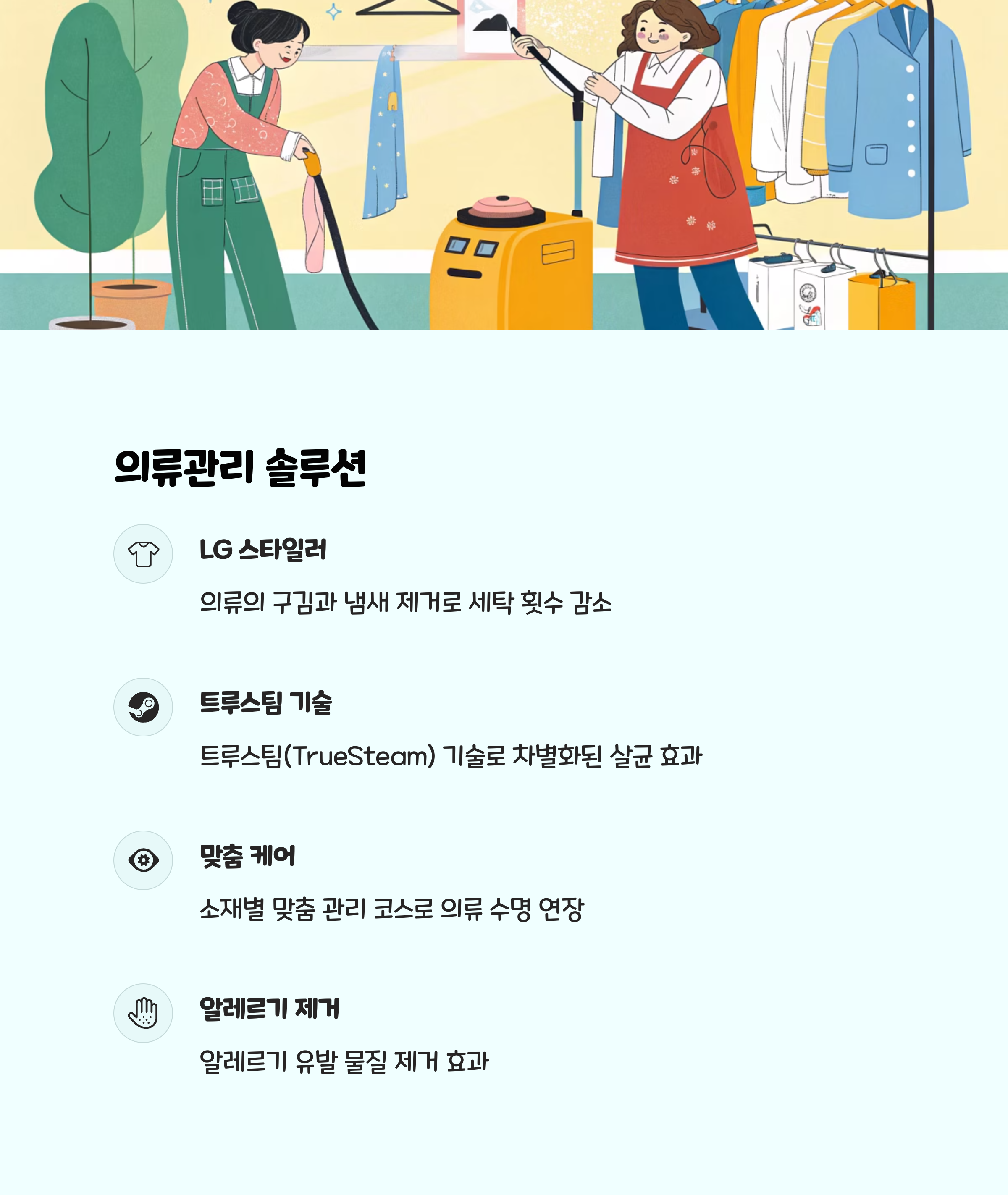 - LG 스타일러, 트루스팀 건조기 등 스팀 살균 기능이 탑재된 가전은 황색포도상구균, 녹농균, 폐렴간균 등 유해 세균을 99.99%까지 살균하며, 집먼지진드기도 100% 사멸시킵니다.