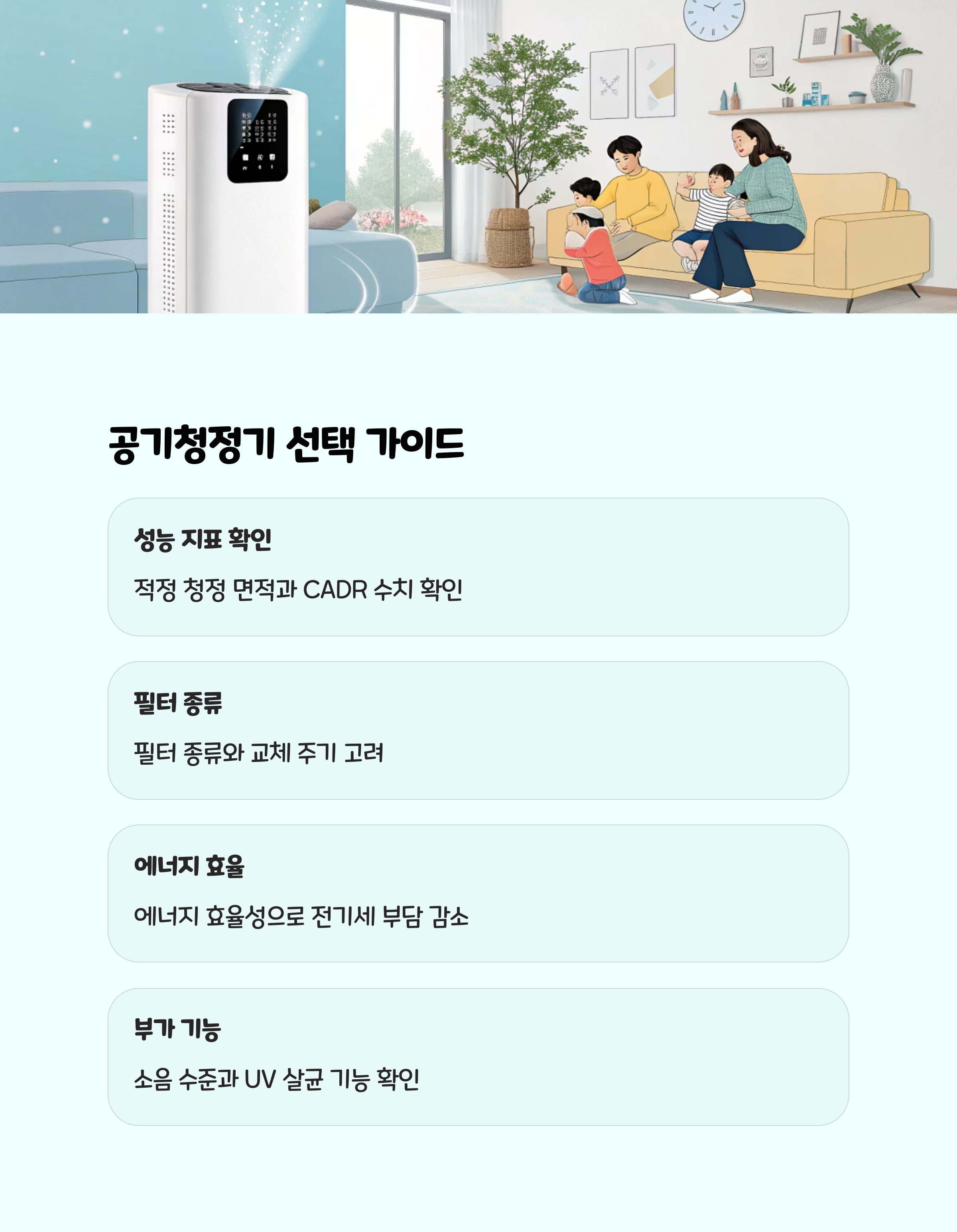 가족의 건강 상태, 생활 패턴, 제품의 주요 기능, 에너지 효율, 인증 여부 등을 꼼꼼히 확인하세요. 사용 편의성, 유지비용, 사후 서비스도 중요한 선택 기준입니다. 가족 모두의 건강과 편의를 최대화할 수 있는 제품을 선택하는 것이 가장 중요합니다.