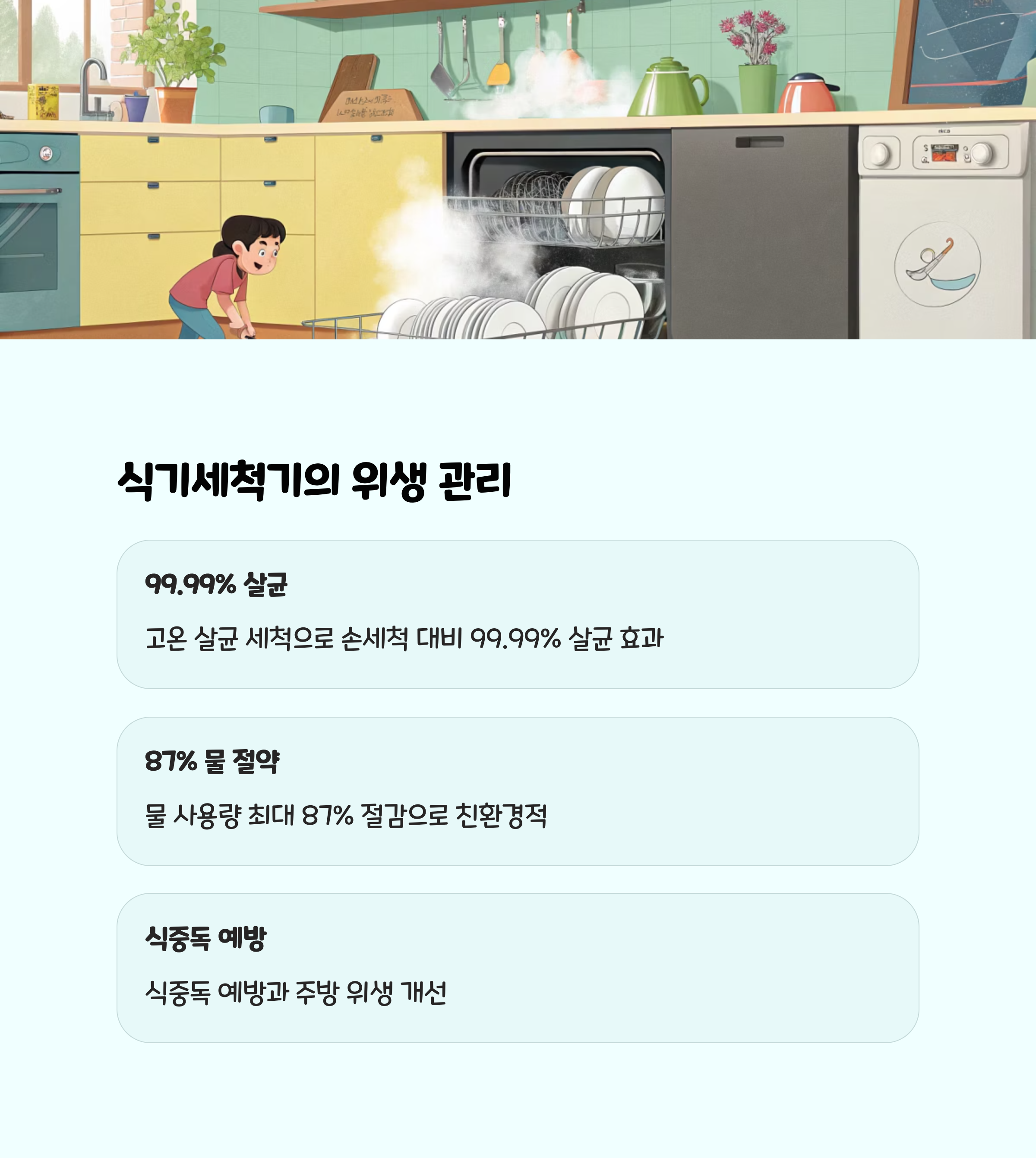 - 식기세척기는 고온 스팀 살균으로 대장균, 살모넬라, 노로바이러스 등 식중독균을 99.999% 제거해, 손 설거지보다 훨씬 위생적인 결과를 제공합니다.