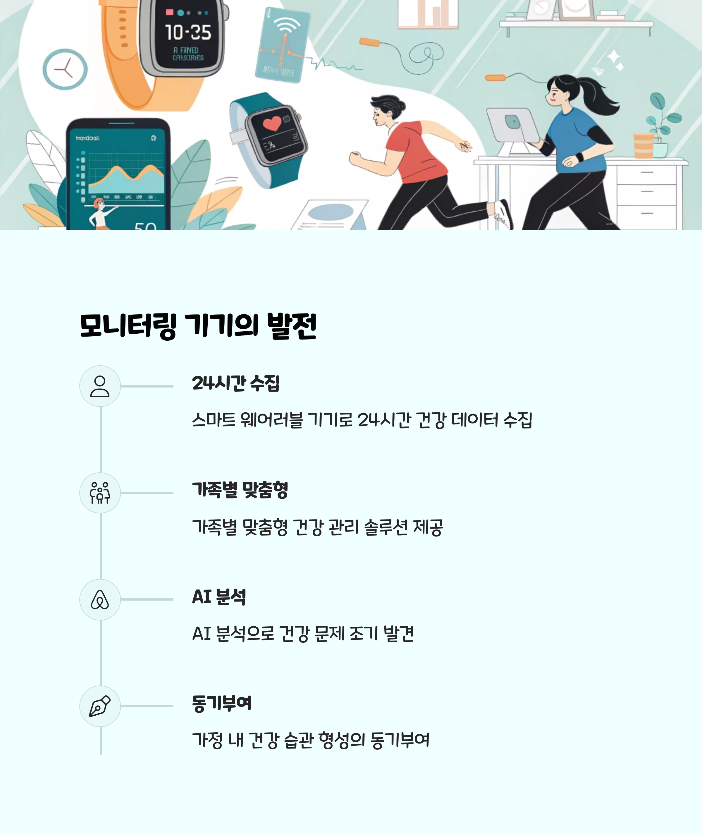 - 스마트 체중계, 혈압계 등 헬스케어 기기는 가족 각자의 건강 데이터를 손쉽게 기록·관리할 수 있습니다.