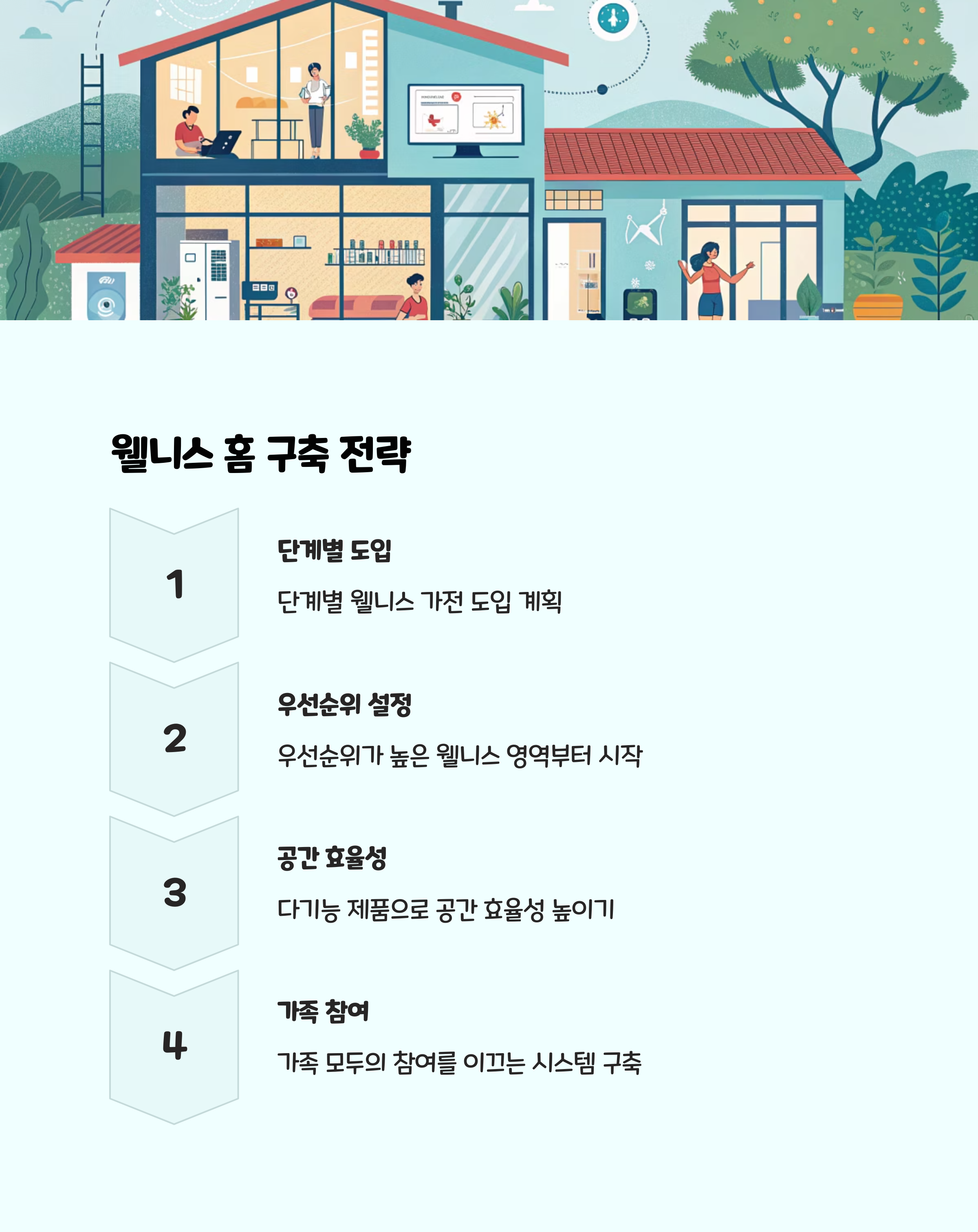 방마다 공기청정기 배치: 가족별 방에 맞는 크기의 공기청정기를 두면, 미세먼지와 알레르기 예방 효과가 극대화됩니다.스팀 살균 코스 적극 활용: 주 1~2회 의류관리기, 건조기, 식기세척기의 살균 기능을 사용해 집안 위생을 한 단계 업그레이드하세요.스마트 주방으로 건강한 식단 실천: 냉장고의 식재료 알림, 자동 레시피 추천 기능을 활용해 가족 모두가 건강한 식습관을 갖도록 유도하세요.웨어러블 기기로 건강 데이터 공유: 가족끼리 운동 목표를 정하고, 스마트워치 데이터를 공유해 서로의 건강을 응원하세요.디지털 웰니스 계획 세우기: 가족 회의 시간에 스크린 타임 규칙을 정하고, 오프라인 활동을 늘려보세요.