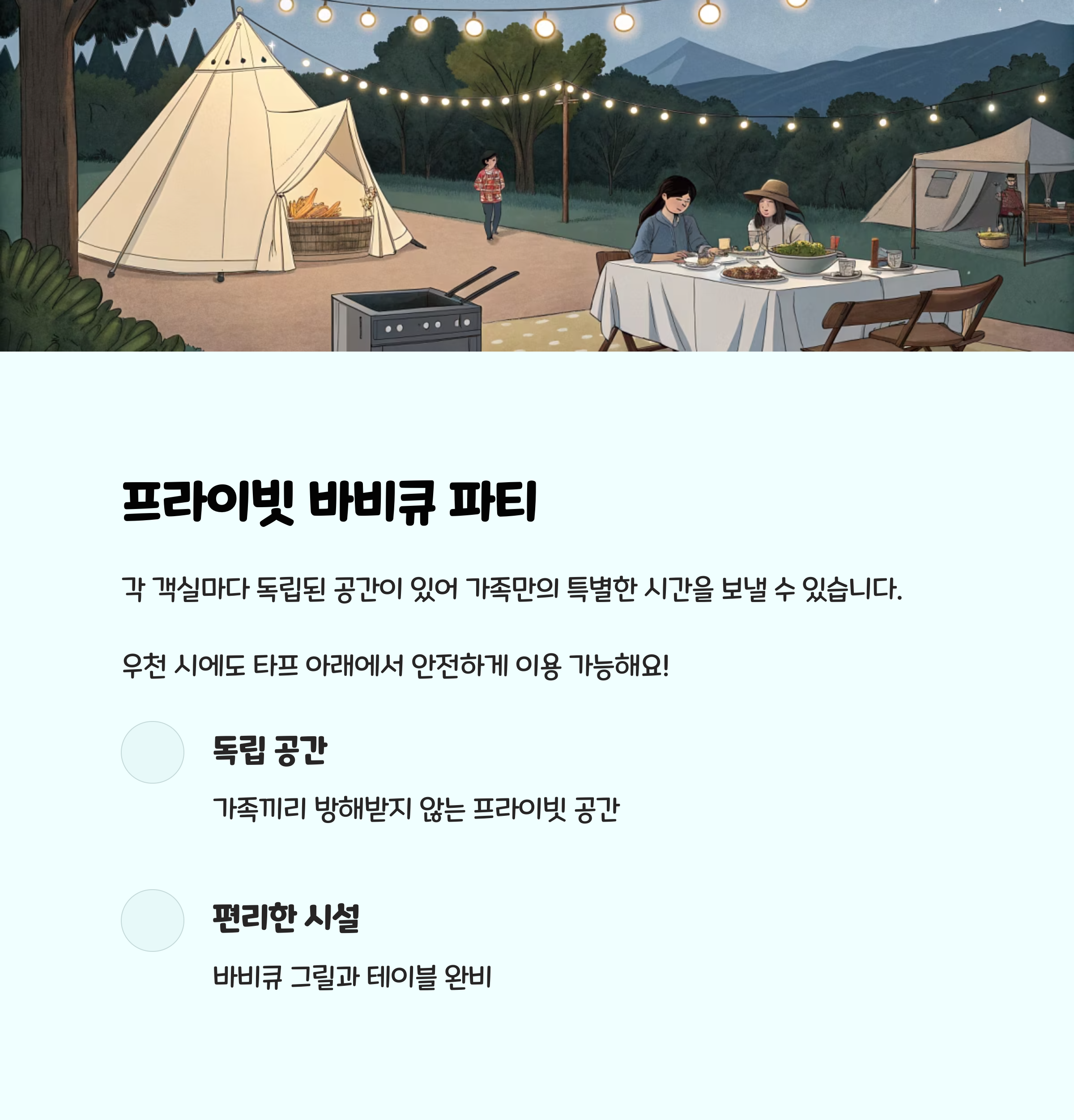 | 바비큐장 | 개별 공간, 준비물 최소화, 프라이빗한 분위기 | “밤에 바비큐파티가 인상적” |
