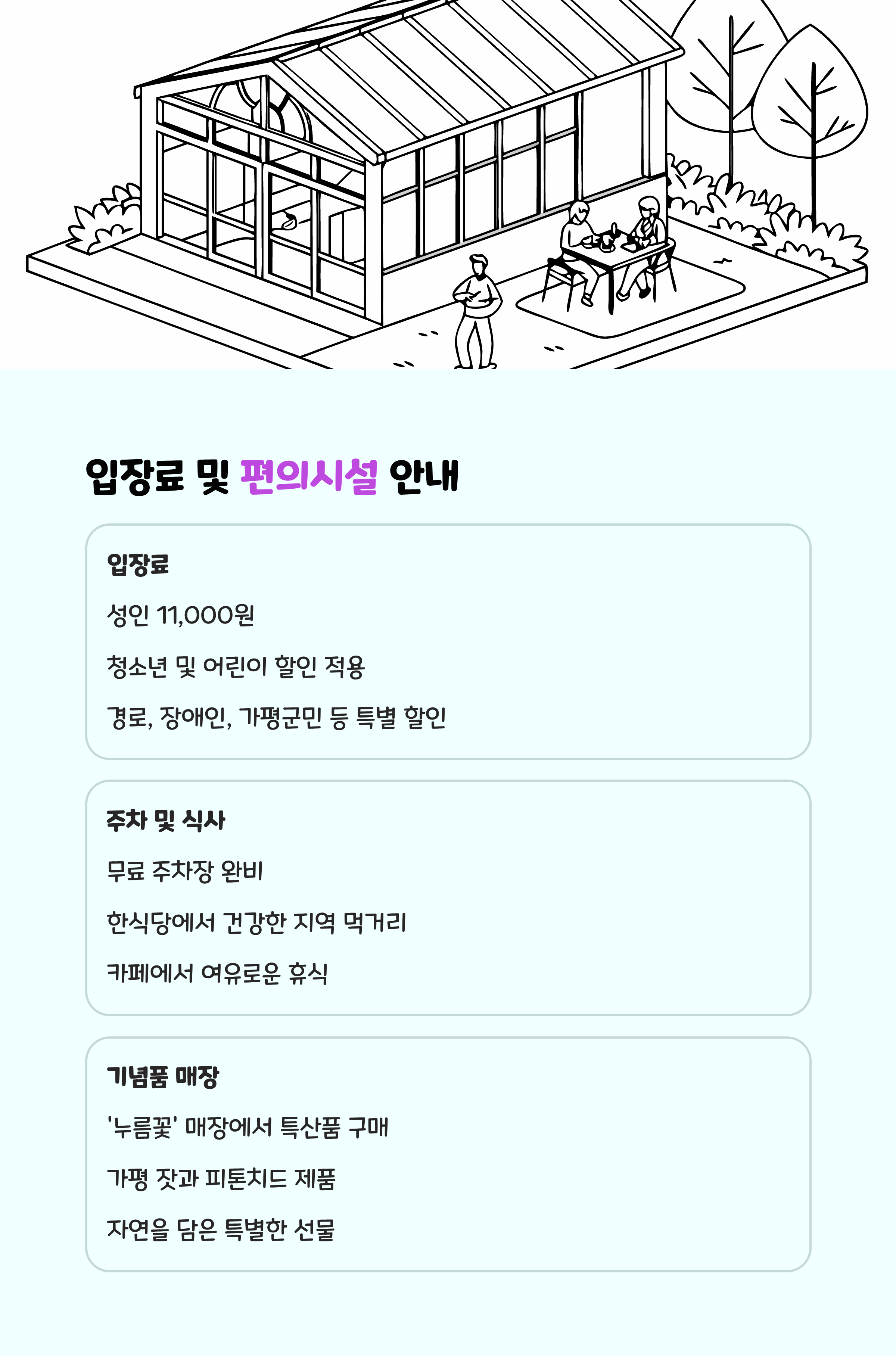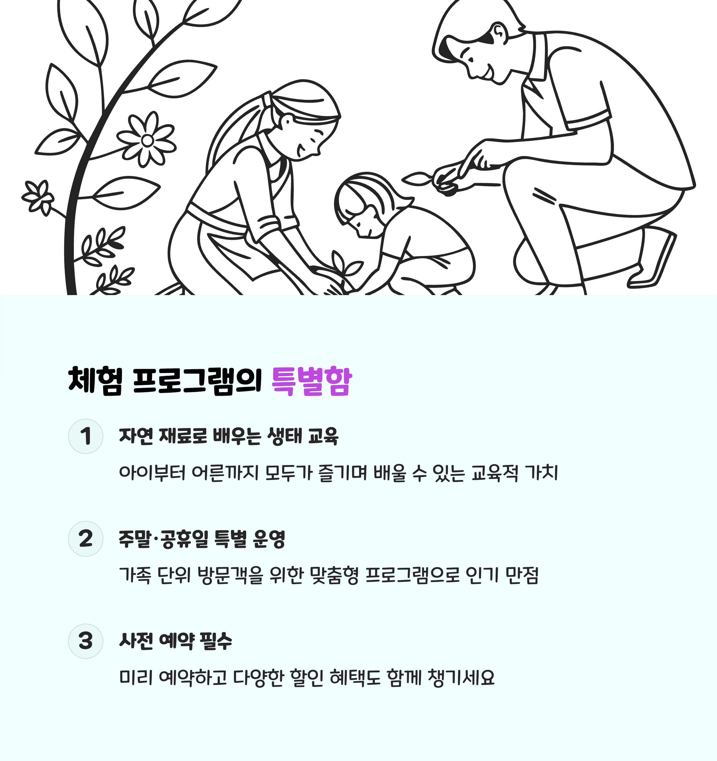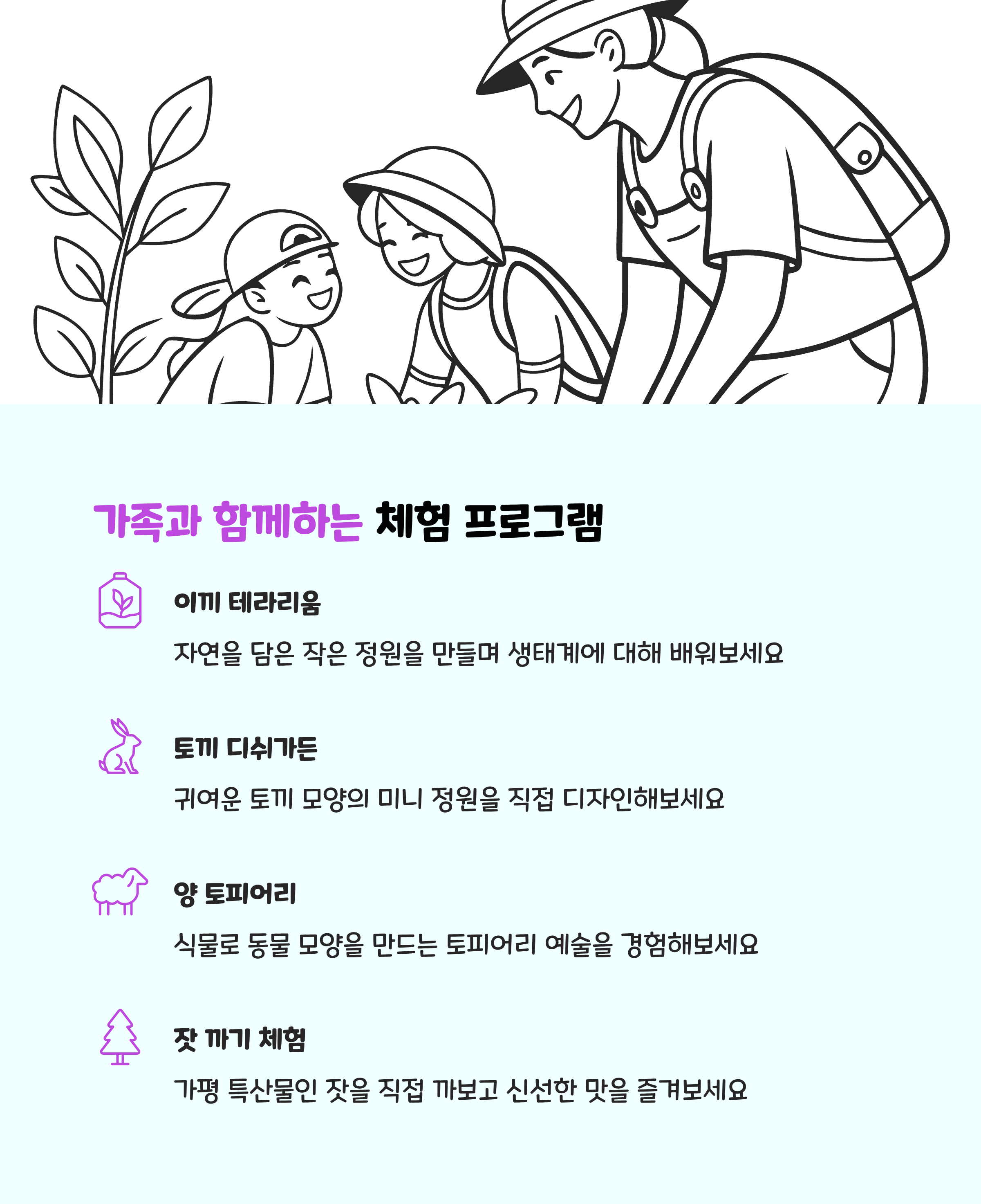 이외에도 다육 식물 화분 꾸미기, 정원 해설 산책 등 가족과 함께 즐길 수 있는 체험이 마련되어 있어 자연과 교감하는 소중한 시간을 보낼 수 있습니다.