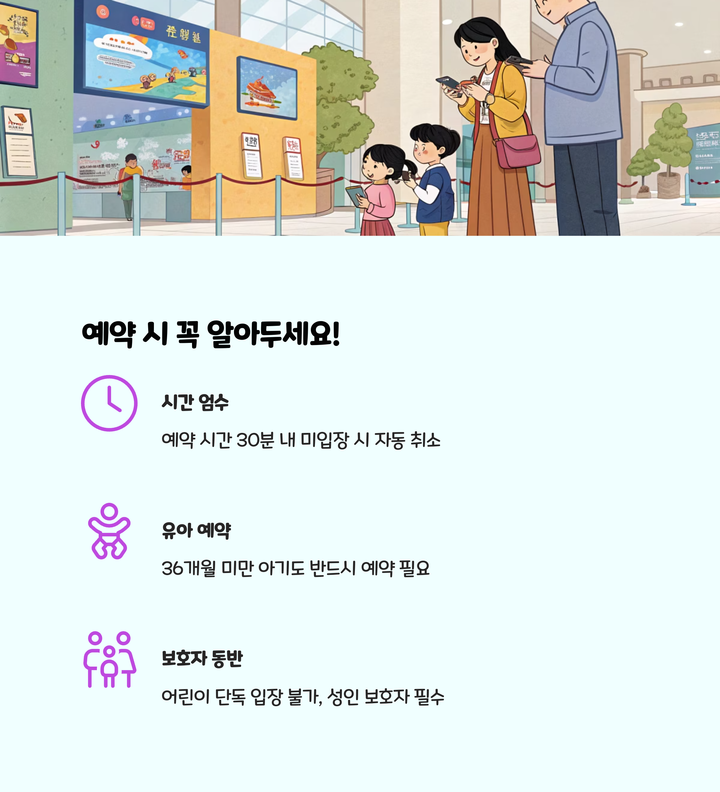 대부분의 가족 체험 프로그램은 보호자 동반이 필수입니다. 어린이가 단독으로 참여하는 것은 불가하며, 반드시 보호자가 함께해야 합니다. 이는 안전과 원활한 체험 진행을 위한 조치이니 참고 바랍니다.