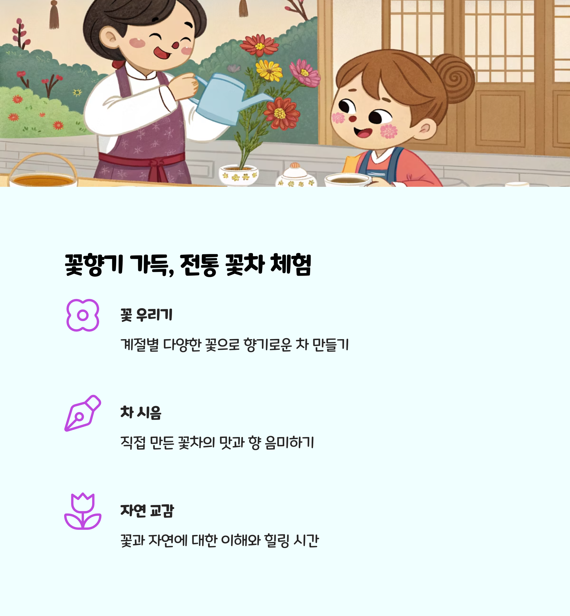 • 특징: 1차시에는 도자기 상설전시 교육과 찻잔 빚기, 2차시에는 꽃차 탐색과 시음 체험이 이어지며, 가족이 함께 만든 찻잔과 계절 꽃차 음료는 집으로 가져갈 수 있습니다.