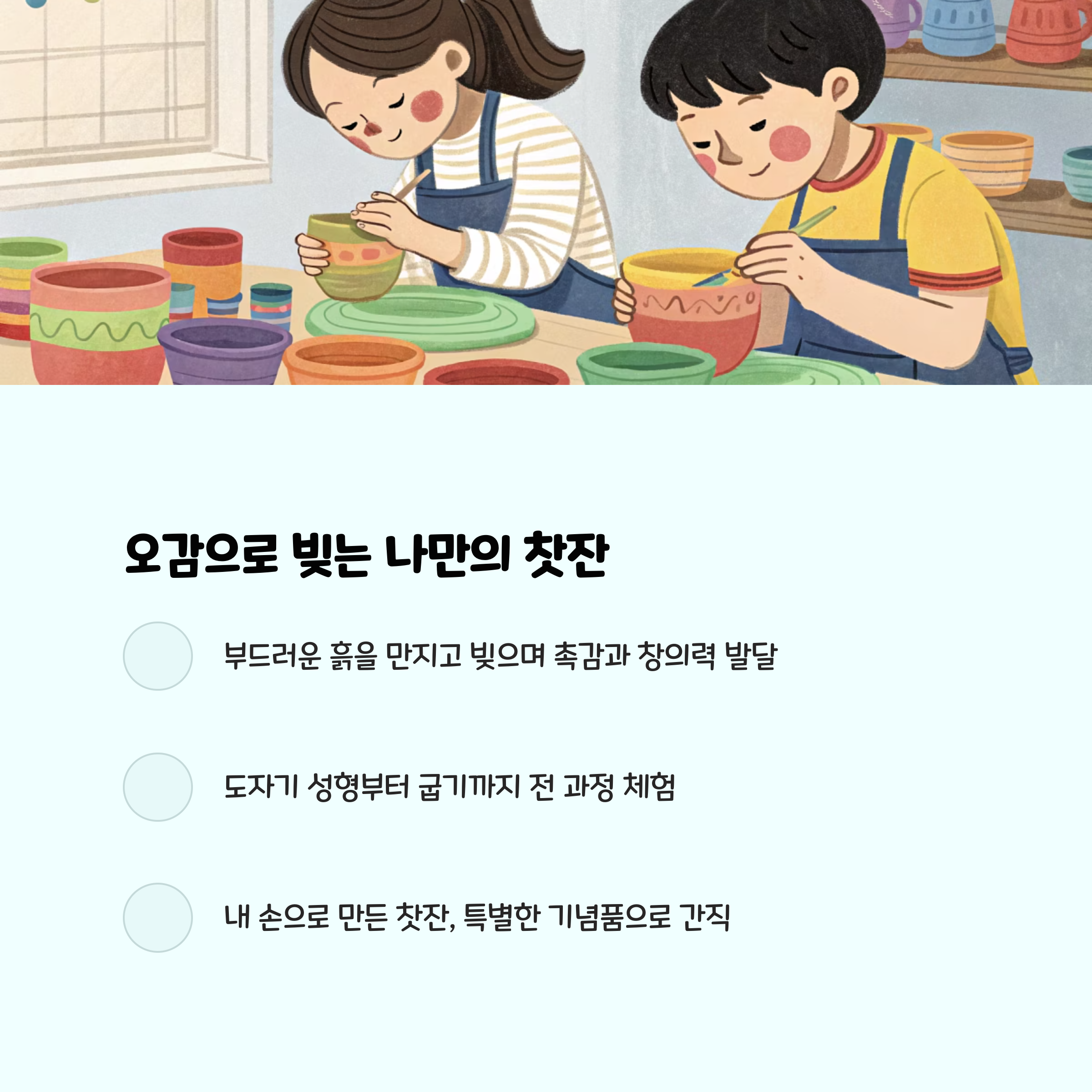 올해 여름방학의 대표 프로그램으로는 ‘오감으로 빚은 찻잔’을 추천합니다. 이 프로그램은 경기도자박물관과의 협력으로 진행되며, 찻잔 만들기와 꽃차 체험을 결합해 어린이와 보호자가 직접 흙을 만지고, 차를 우리며 오감을 자극하는 활동으로 구성되어 있습니다.