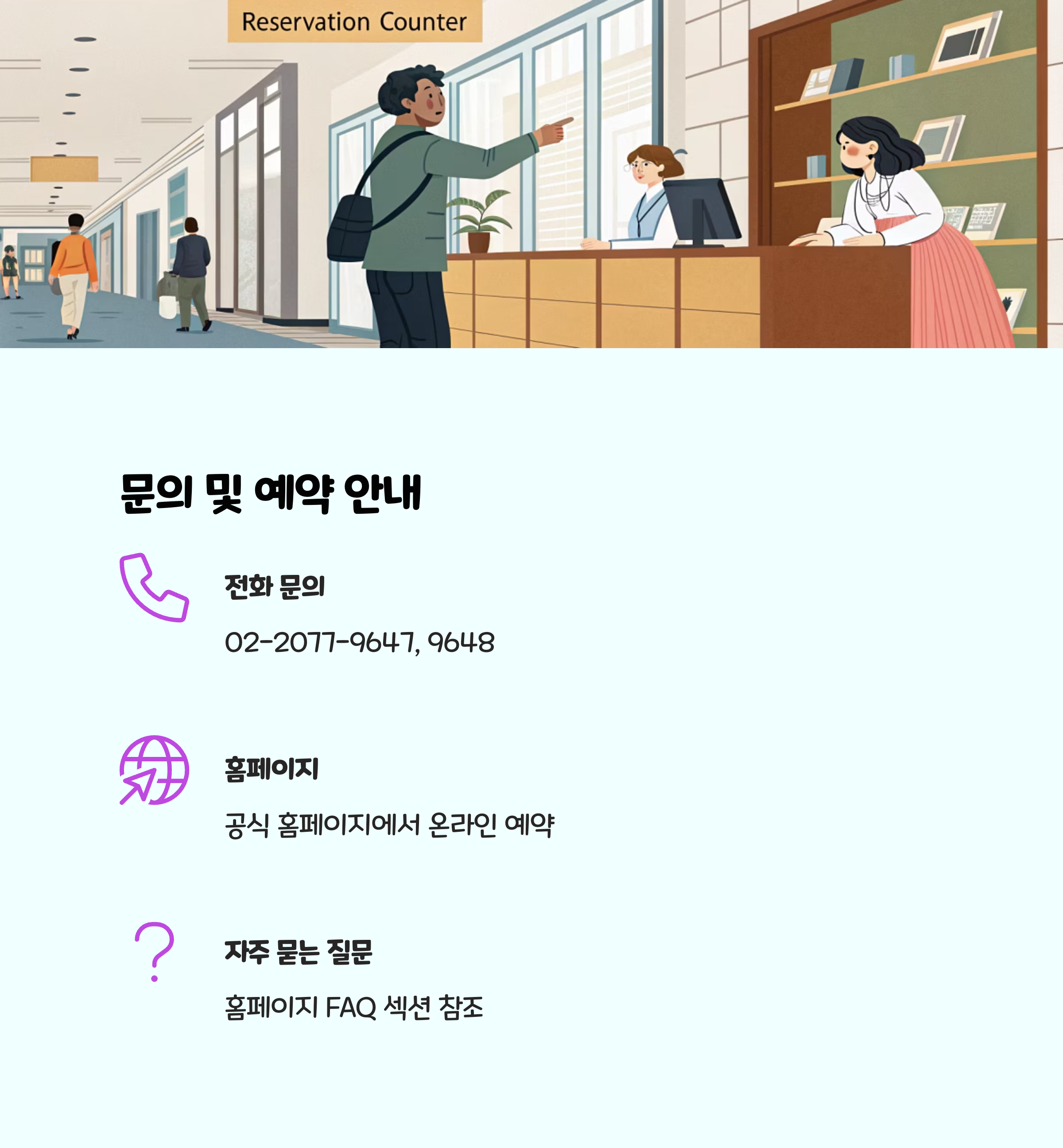 • 휴관일: 매주 월요일, 1월 1일, 설날·추석 당일