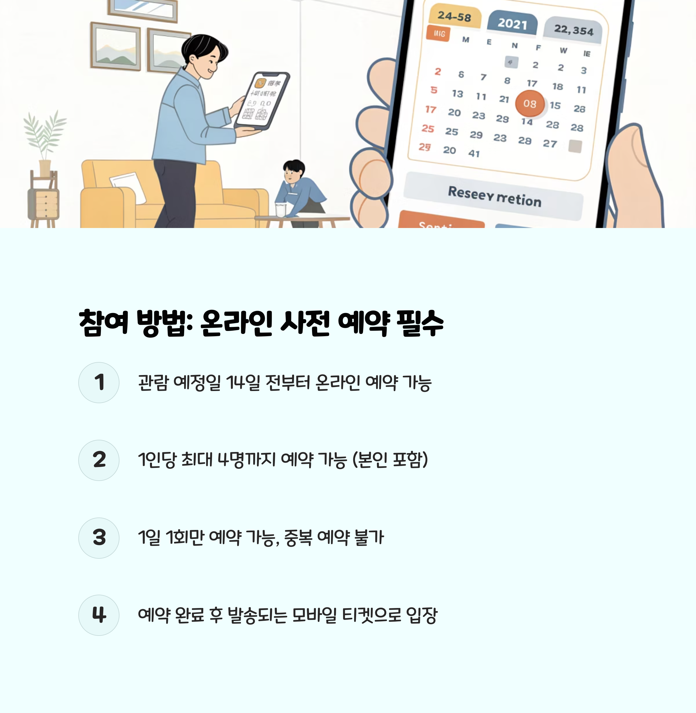 박물관 공식 홈페이지에서 방문일 기준 1주일 전부터 입장권을 예매할 수 있습니다. 입장권 예매 시 인원과 시간대를 선택해야 하며, 방학 기간에는 조기 매진될 수 있으니 미리 예매하는 것이 좋습니다.