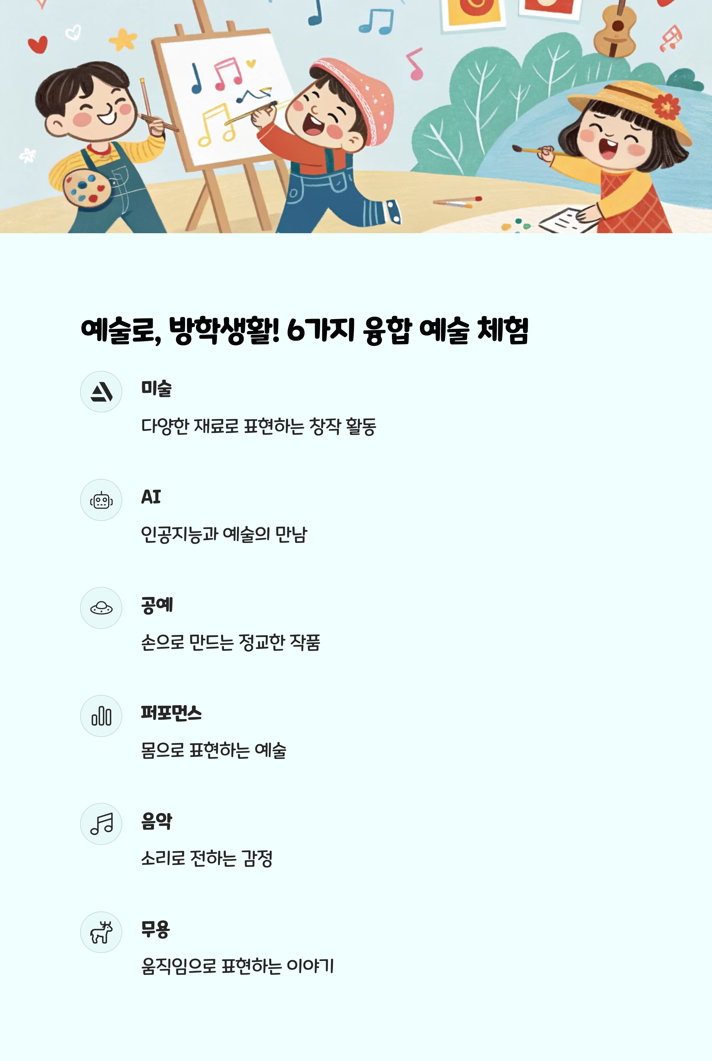 • 구성: 문해력과 예술을 결합한 6가지 체험(인공지능, 공예, 퍼포먼스, 음악, 무용, 미술)