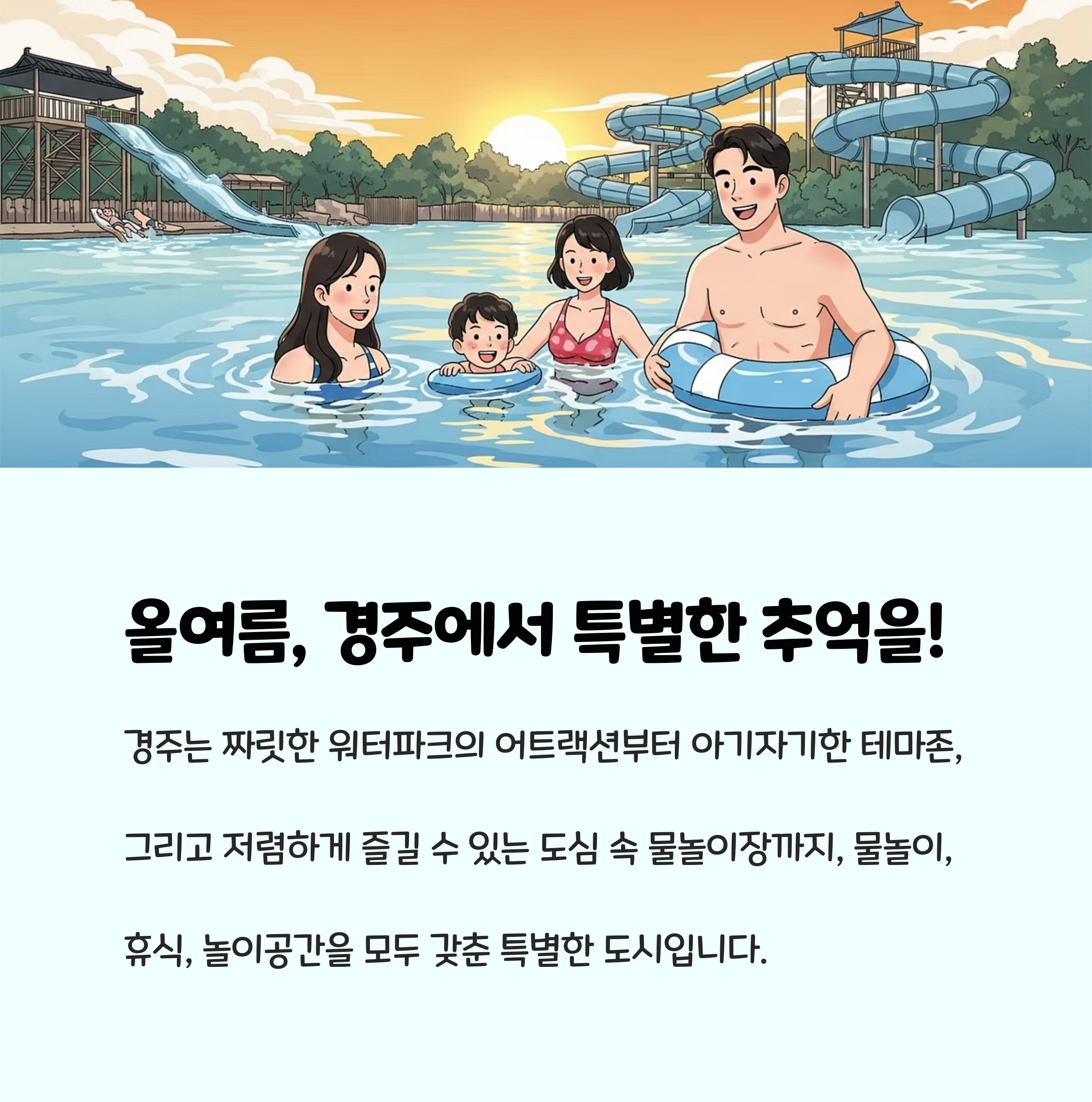여름휴가철이 되면 ‘우리 가족이 신나게 즐기면서 추억도 남길 수 있는 경주 물놀이 명소가 없을까?’라는 고민을 하게 됩니다. 특히 어린 자녀가 있다면, 모두가 안전하고 만족할 만한 장소를 찾는 게 참 어렵죠. 이런 분들을 위해 경주 대표 물놀이 명소와 인기 테마파크, 그리고 뽀로로파크까지 가족 맞춤 핵심 가이드를 안내합니다.