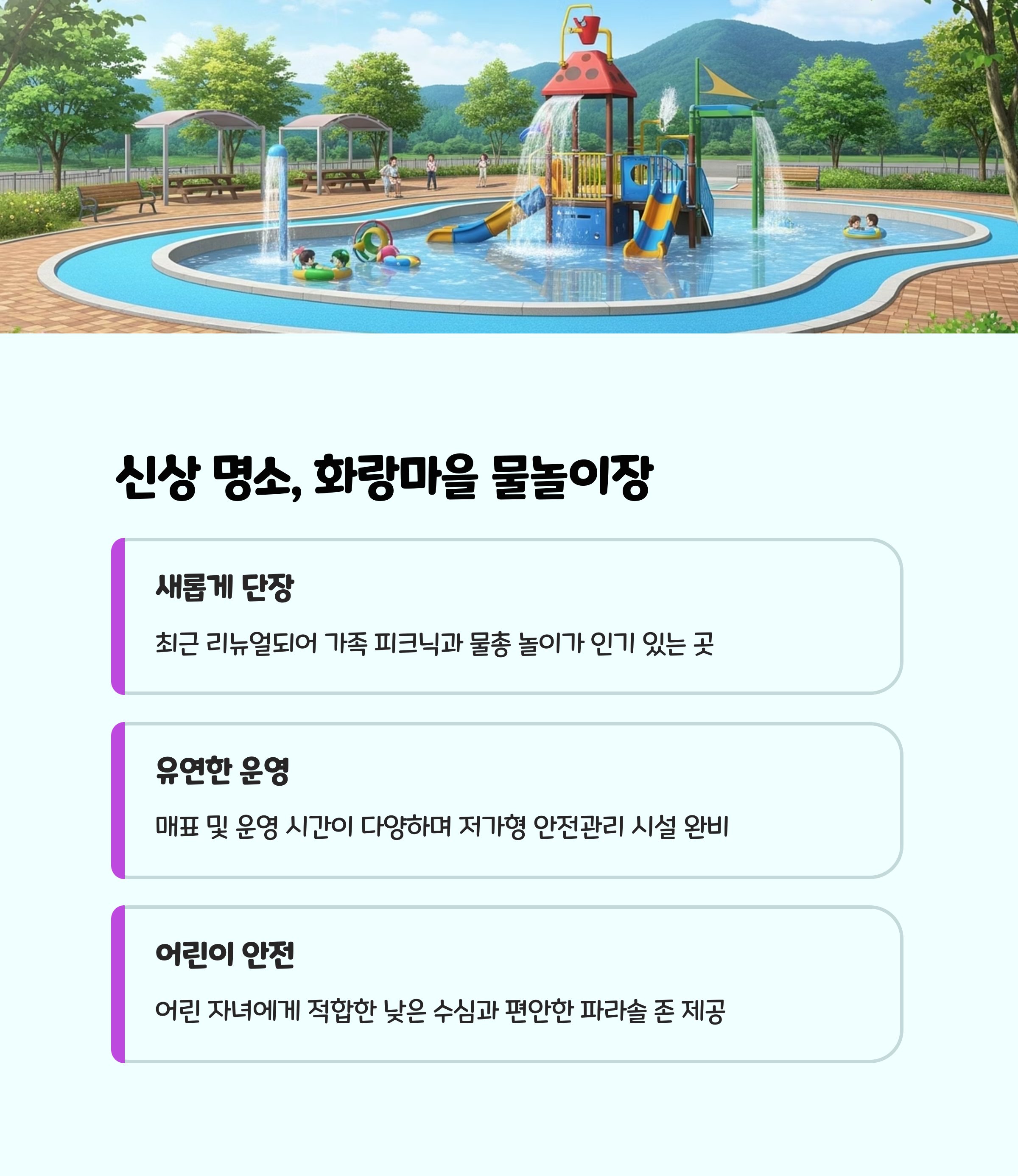 시설/특징 대형 슬라이드·유수풀·파도풀 뽀로로 테마 온수풀·놀이시설 무료·그늘막·안전요원 상주 야외 대형 수영장·스마트대기제