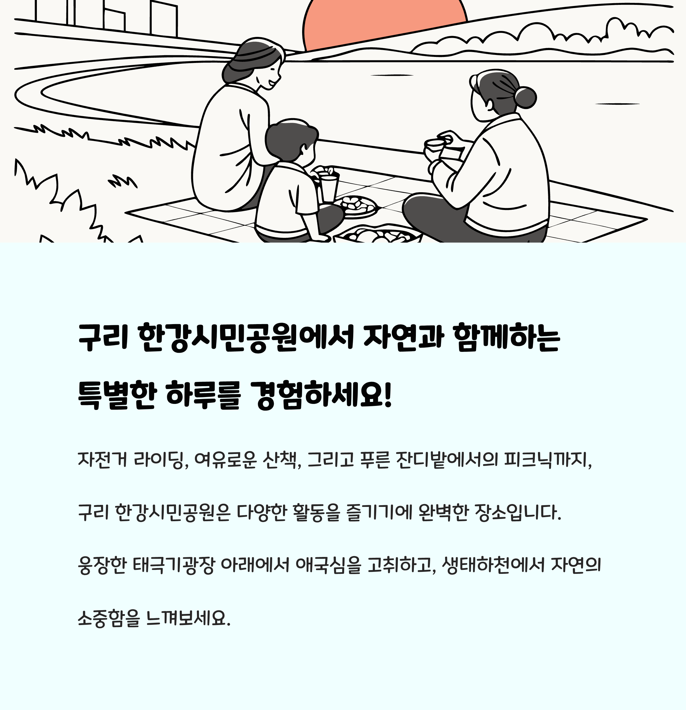 구리 한강시민공원은 자연과 함께 안전한 자전거 산책을 즐기며 아이들과 가족이 한데 어울려 체험과 힐링을 할 수 있는 최적의 장소입니다. 편리한 접근성, 다양한 편의시설, 풍부한 체험 프로그램까지 완벽하게 갖추어져 있기에 가족 나들이나 주말 여가활동 고민에 확실한 해답이 될 것입니다. 이곳에서 한강의 싱그러움과 도시 가까운 자연의 여유를 만끽해 보시길 바랍니다.