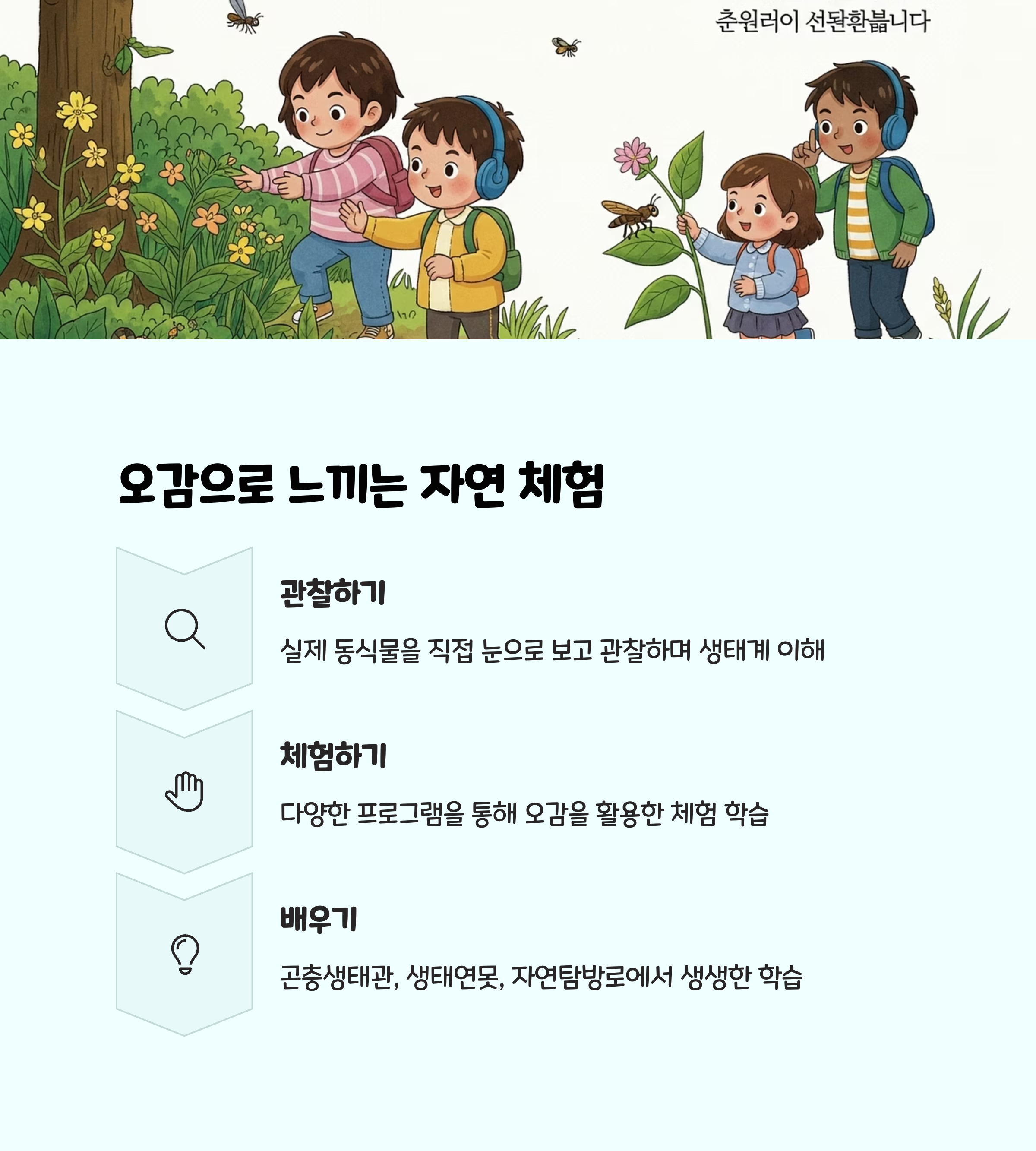 어린이들이 자연 속에서 동식물을 직접 관찰하고 오감을 활용해 체험하는 교육 프로그램입니다. 곤충생태관, 생태연못, 탐방로 등 다양한 장소에서 생태를 배우며 과학교과과정을 연계해 깊이 있는 학습이 가능합니다. 주말과 방학에 집중 운영됩니다.