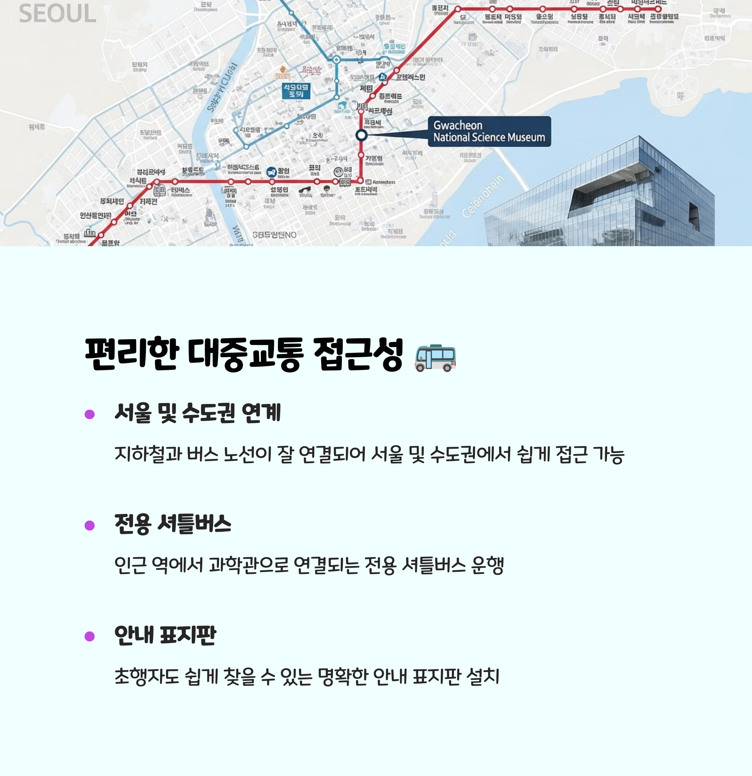 과천과학관은 대중교통(지하철 4호선 대공원역 6번출구) 이용이 편리하고, 매일 오전 9시 30분부터 오후 5시 30분까지 운영하므로 일정 조정도 쉽습니다. 단, 월요일과 법정 공휴일 다음날은 휴관이니 방문 전 꼭 일정 확인이 필요합니다.