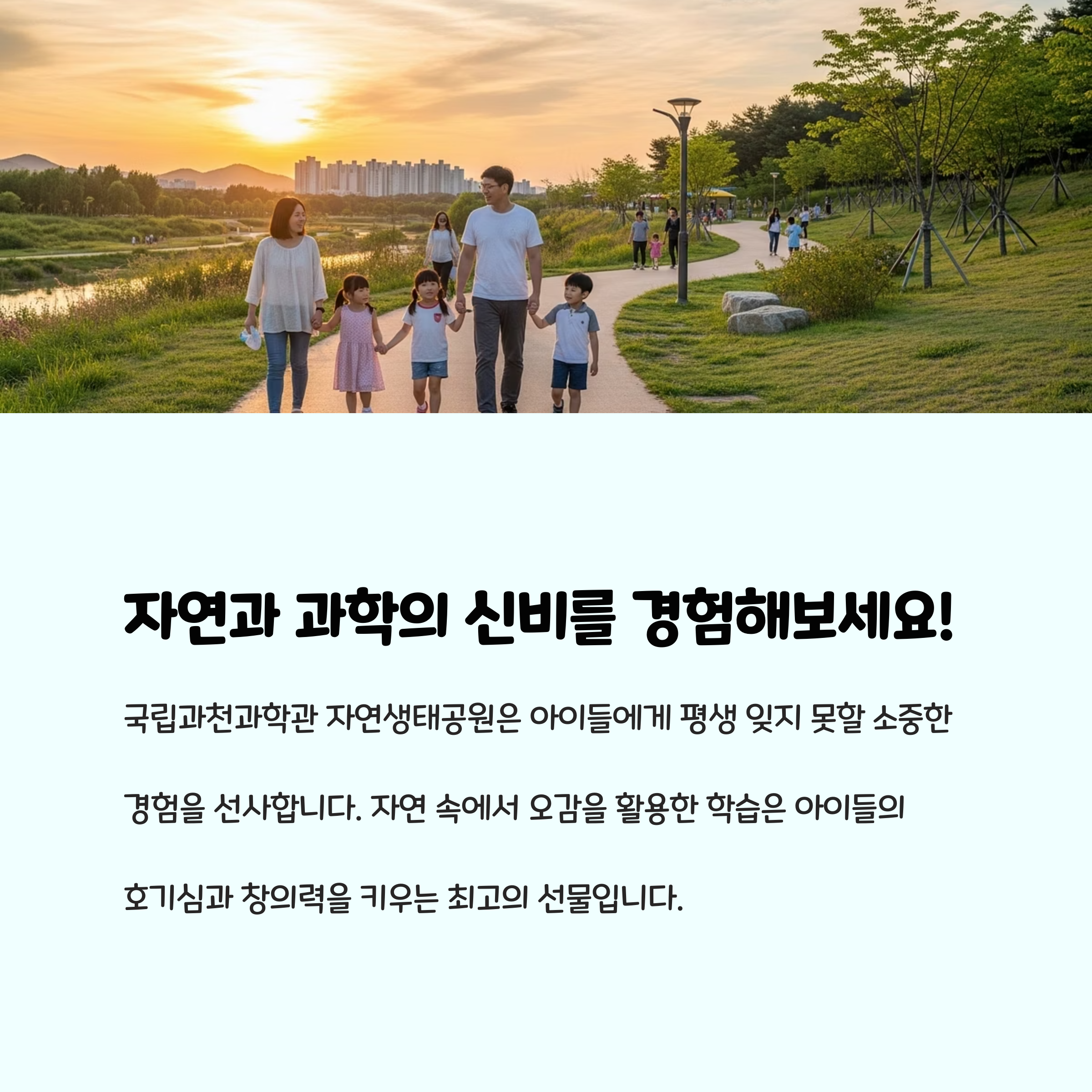 아이와 자연 속에서 뛰노는 생태체험을 고민한다면, 국립과천과학관 자연생태공원만큼 균형 잡힌 교육과 실내외 체험이 결합된 장소는 찾기 어렵습니다. 아이에게 교과서로는 경험할 수 없는 살아있는 자연과 과학을 선물하세요.