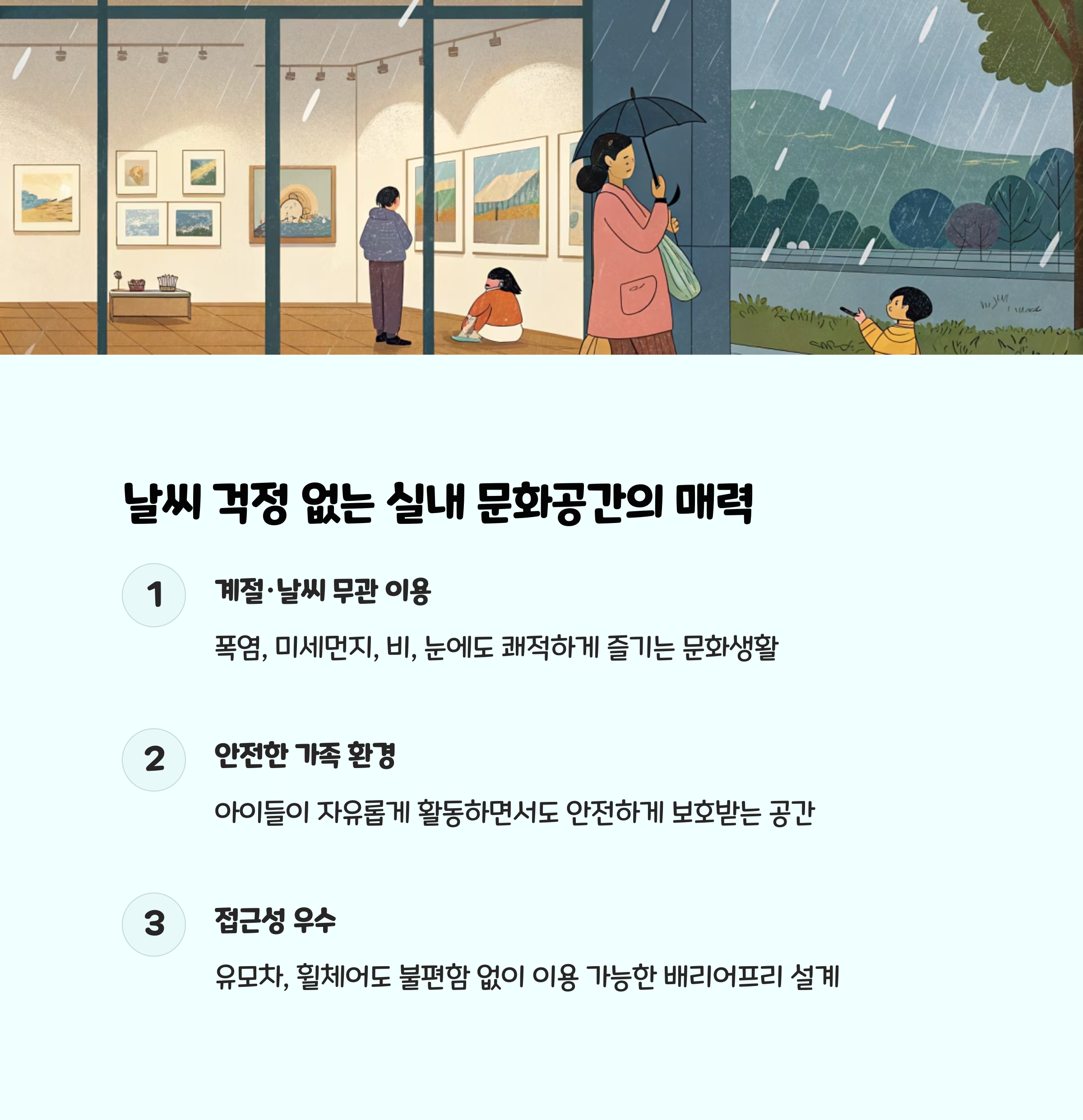 미술관 내부는 넓고 쾌적하여 날씨에 상관없이 언제든 방문하기 좋습니다. 특히 겨울이나 장마철, 미세먼지가 심한 날에도 걱정 없이 아이들과 문화생활을 즐길 수 있습니다. 실내 공간 곳곳에는 휴게 공간과 카페도 마련되어 있어, 전시 관람 중간에 가족이 함께 휴식을 취하기에도 안성맞춤입니다.
