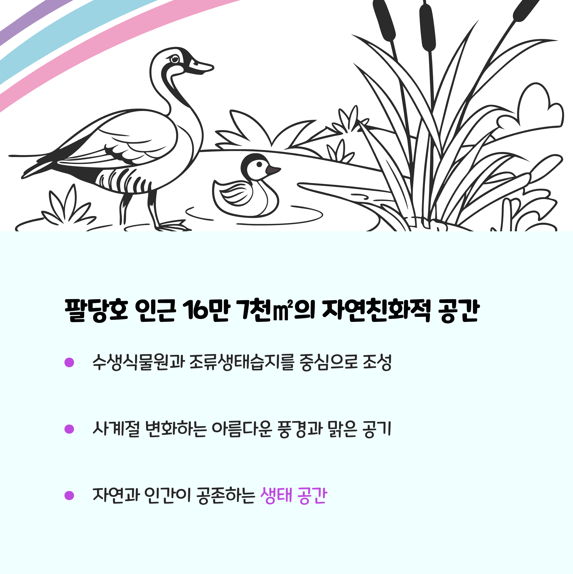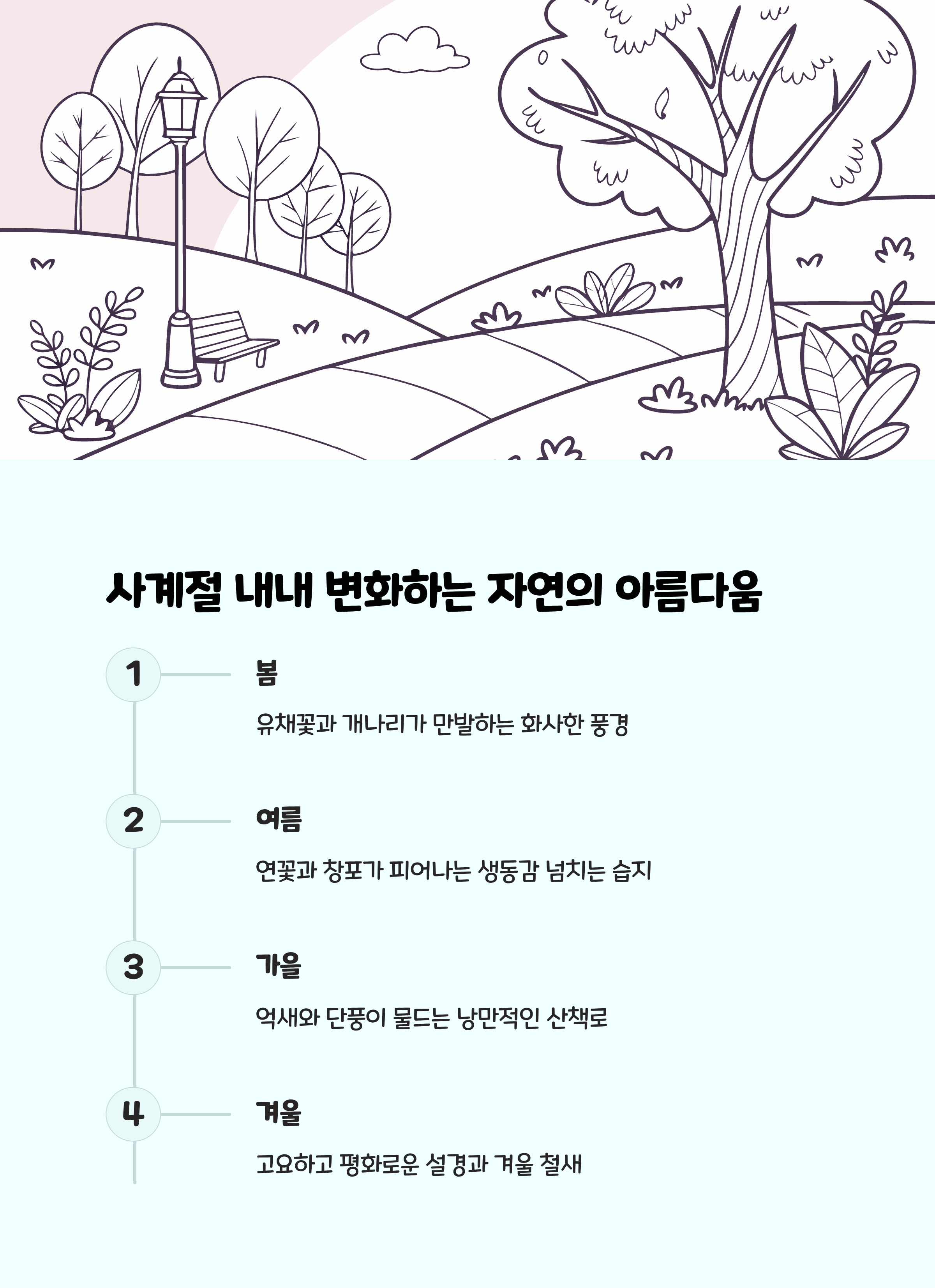 | 생태습지 및 정화습지 | 수질 개선 및 생태계 유지 기능을 하는 습지 | 다양한 동식물의 서식처 역할, 산책 및 체험학습 가능 |