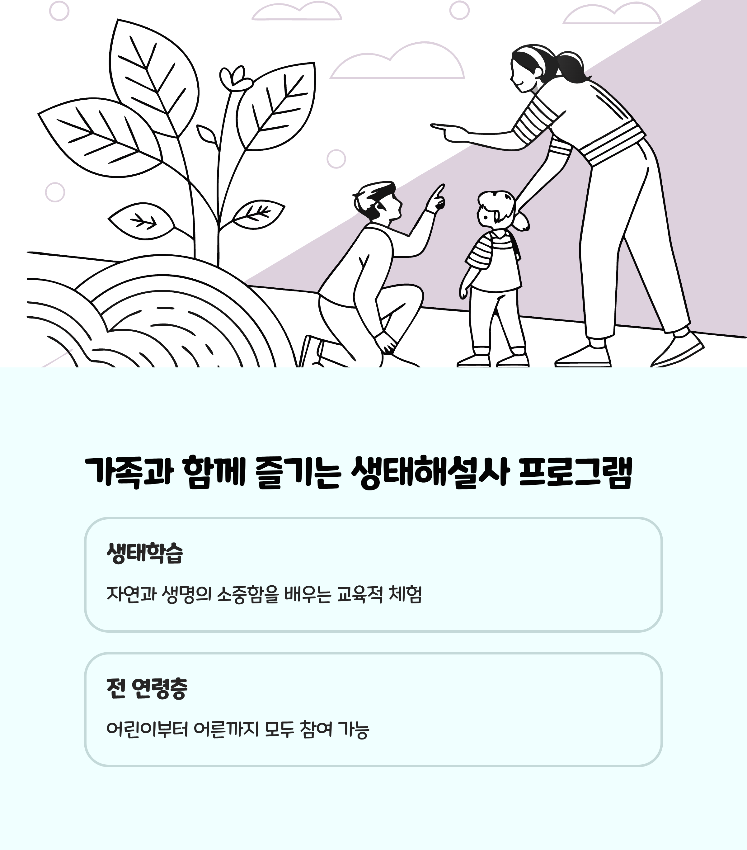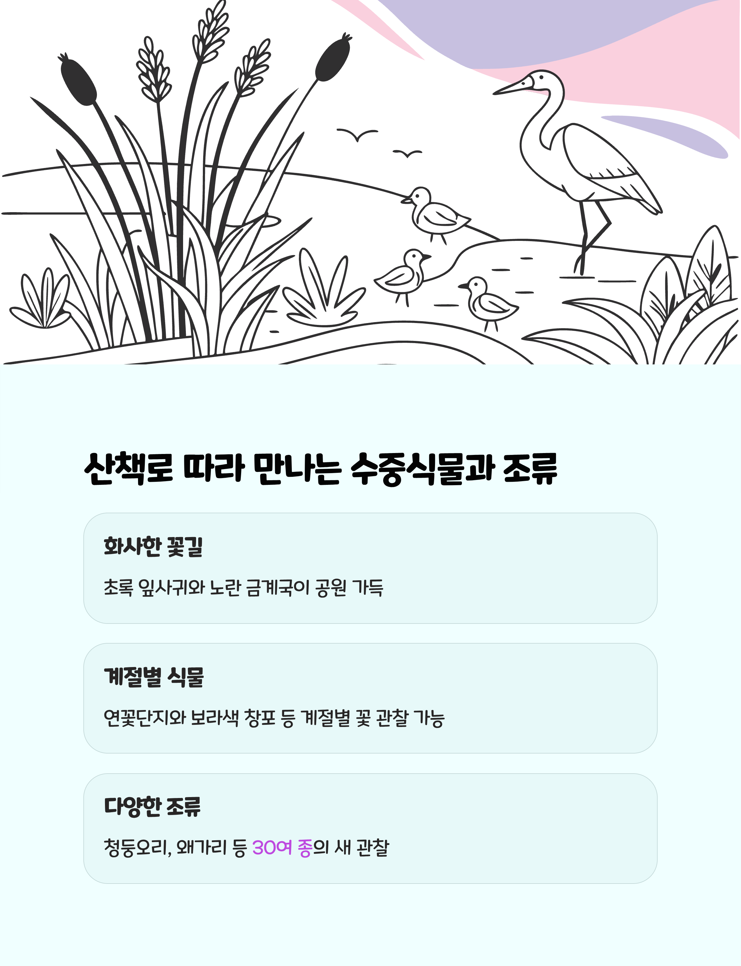 | 수생식물원 | 수중 및 물가 식물군 집중 관찰 공간 | 자연 정화 기능과 식물 다양성 학습 가능 |