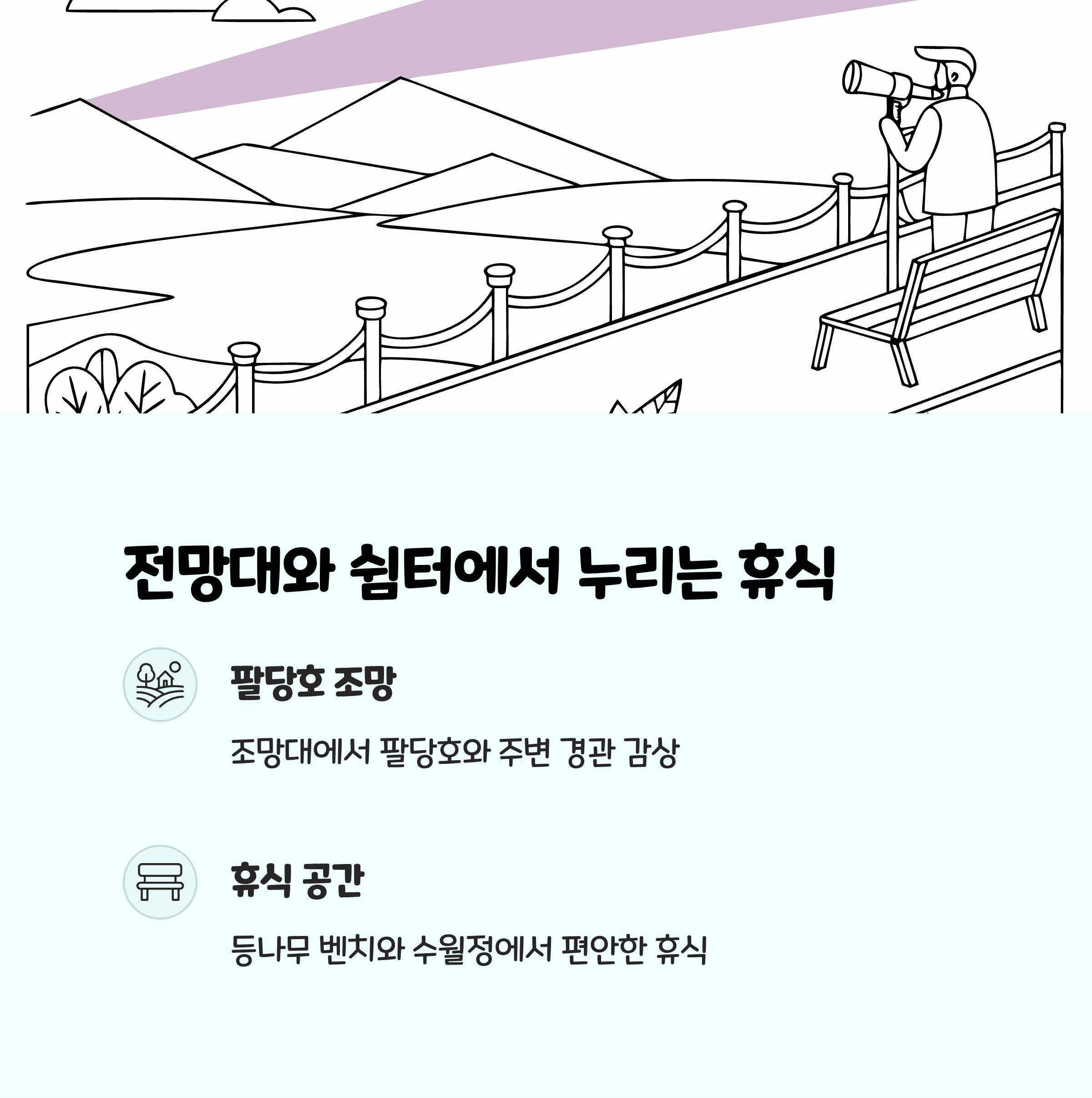 | 전망대 및 쉼터 | 휴식 공간 및 팔당호 경관 조망 | 산책 중 휴식 및 사진 촬영 명소 |