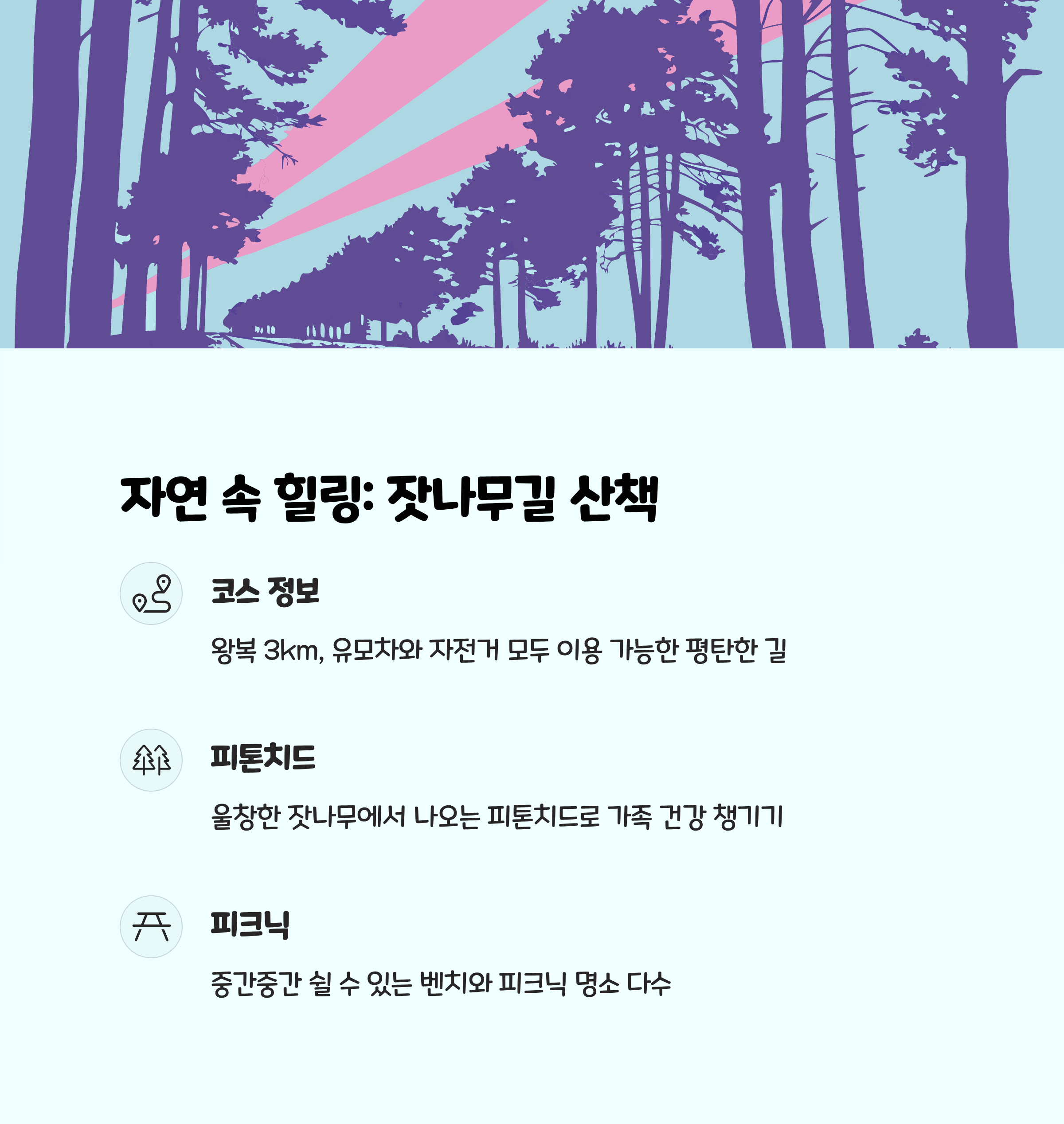 - 오전(10~12시): 잣나무길·숲속 산책, 자연/동물 체험(숲속놀이터, 동물 먹이 주기).