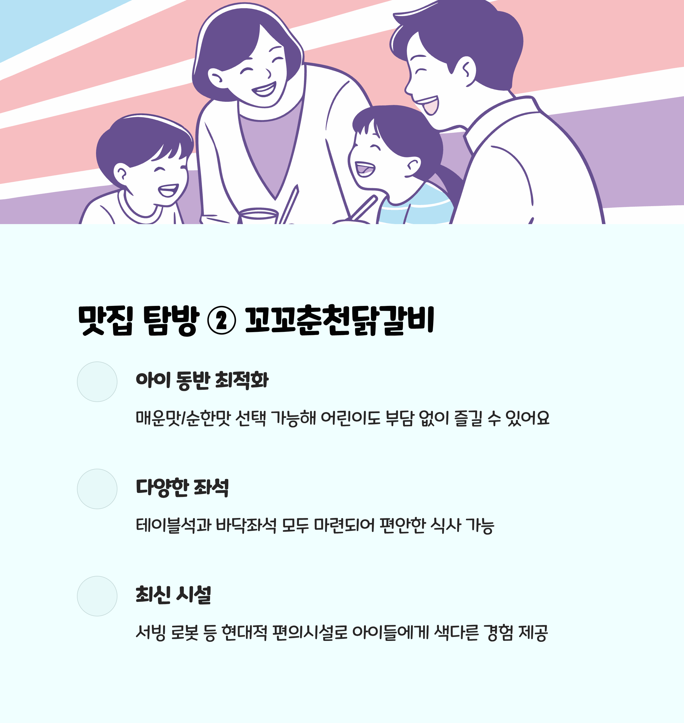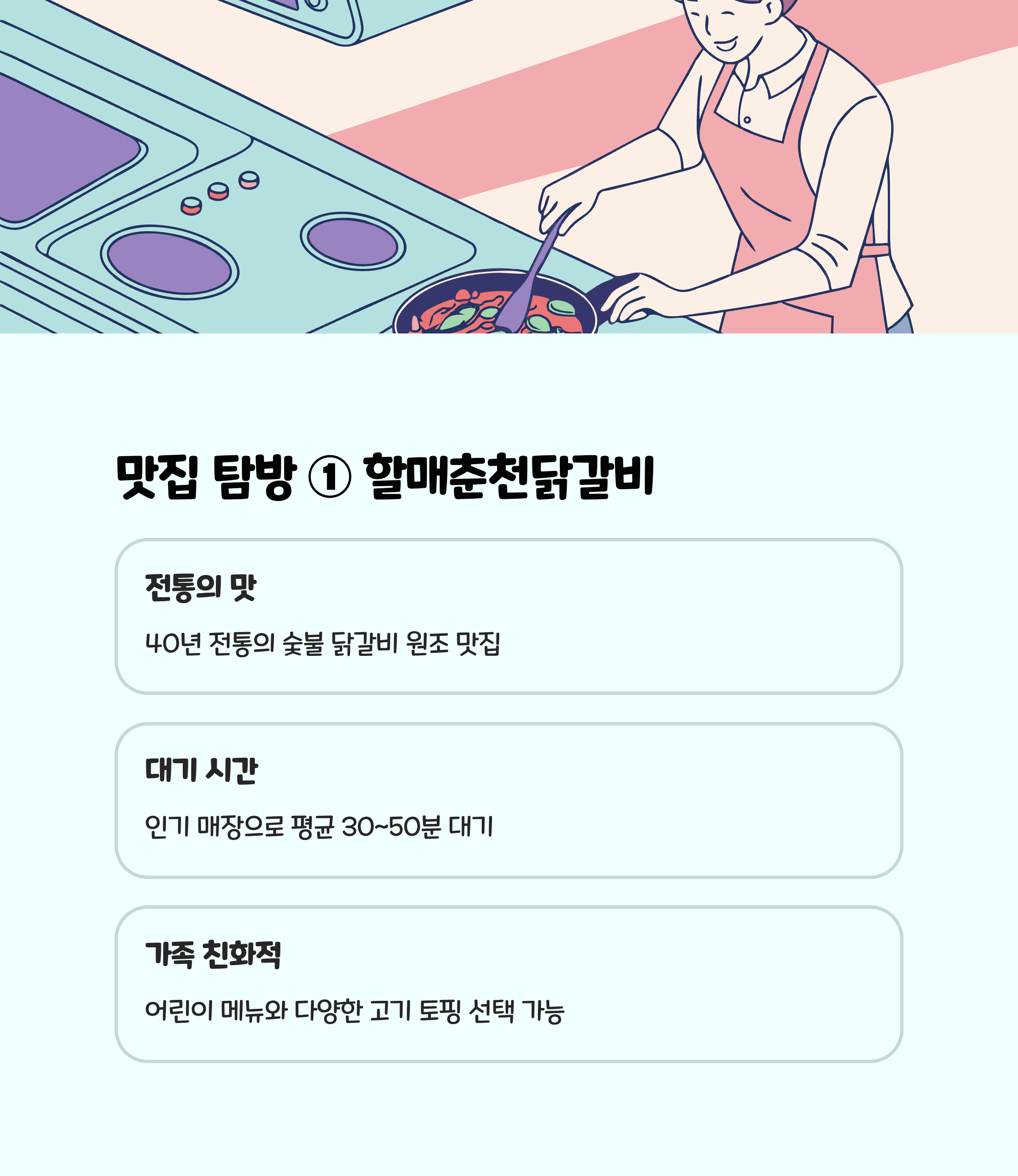 - 점심(12~13시): 할매춘천닭갈비, 꼬꼬춘천닭갈비, 꼬끼옥 중 한 곳 방문.