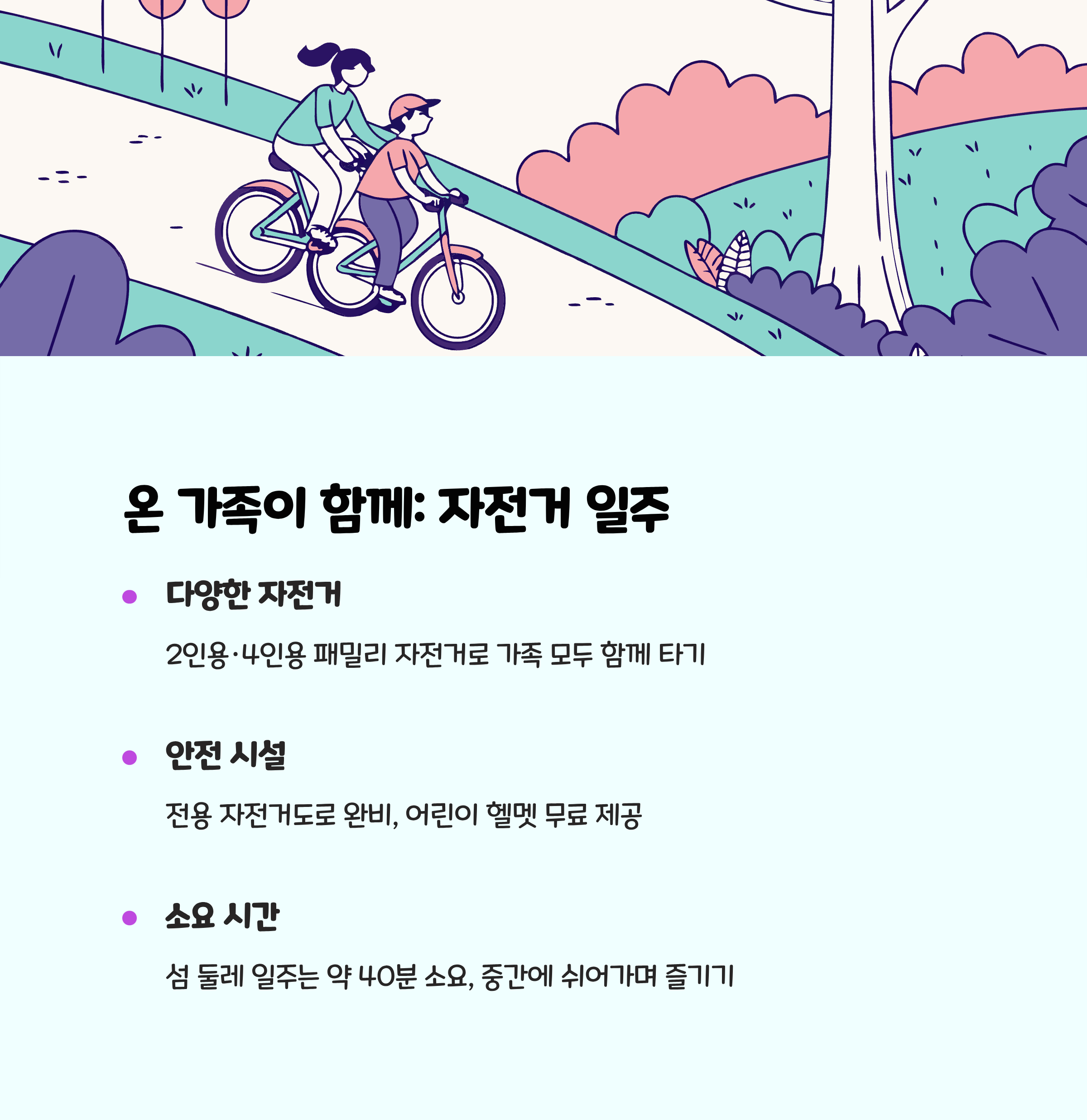 자전거 대여는 기본 1시간당 10,000원 내외이며, 어린이용 카시트가 부착된 자전거도 있습니다. 이용 가능 시간은 보통 오전 9시부터 오후 5시까지로, 더운 날에는 이른 아침이나 늦은 오후 시간대를 권장합니다. 안전장비도 꼭 착용하세요.