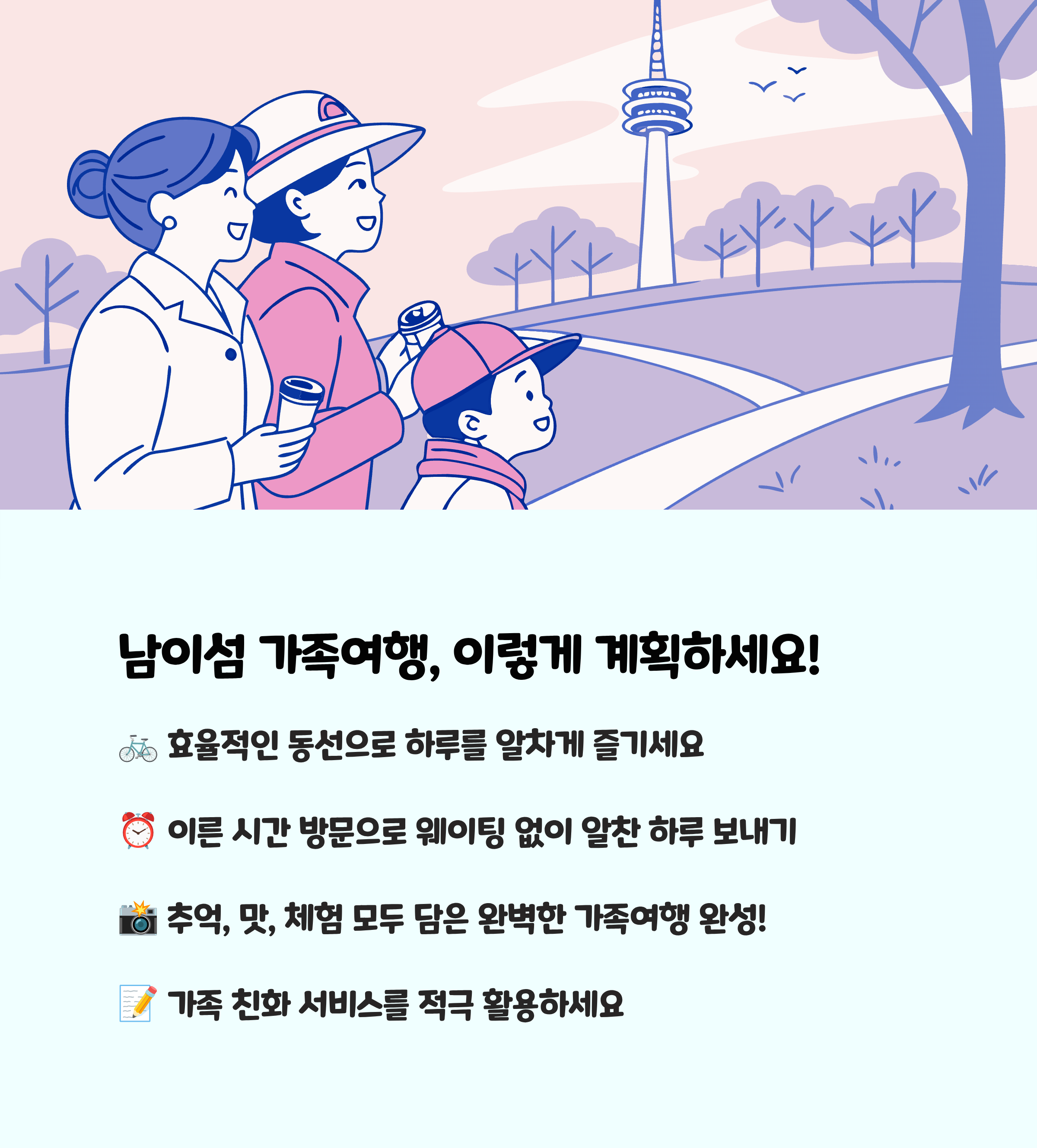 잣나무길 산책: 메타세쿼이아길과 잣나무길을 따라 평지 산책을 하며 가족사진과 힐링을 동시에. (유모차, 휠체어 가능).숲속놀이터 & 동물체험: 대형 미끄럼틀, 그네, 동물 먹이 주기 등 체험 위주 시설 운영, 아이에게 인기.에코 체험·북카페: 에코스테이션 곤충관찰·잎사귀 도장, 그림책 만들기 등 실내·실외 체험 공간 다양.자전거·짚와이어: 가족용 자전거 대여(유아 카시트 자전거 포함 가능), 짚와이어는 만 10세 이상 체험 가능.남이섬 맛집 탐방: 점심은 선착장 인근 또는 남이섬 내 닭갈비·막국수 전문점에서 해결. 웨이팅 대비 방문 시간 조정 추천.