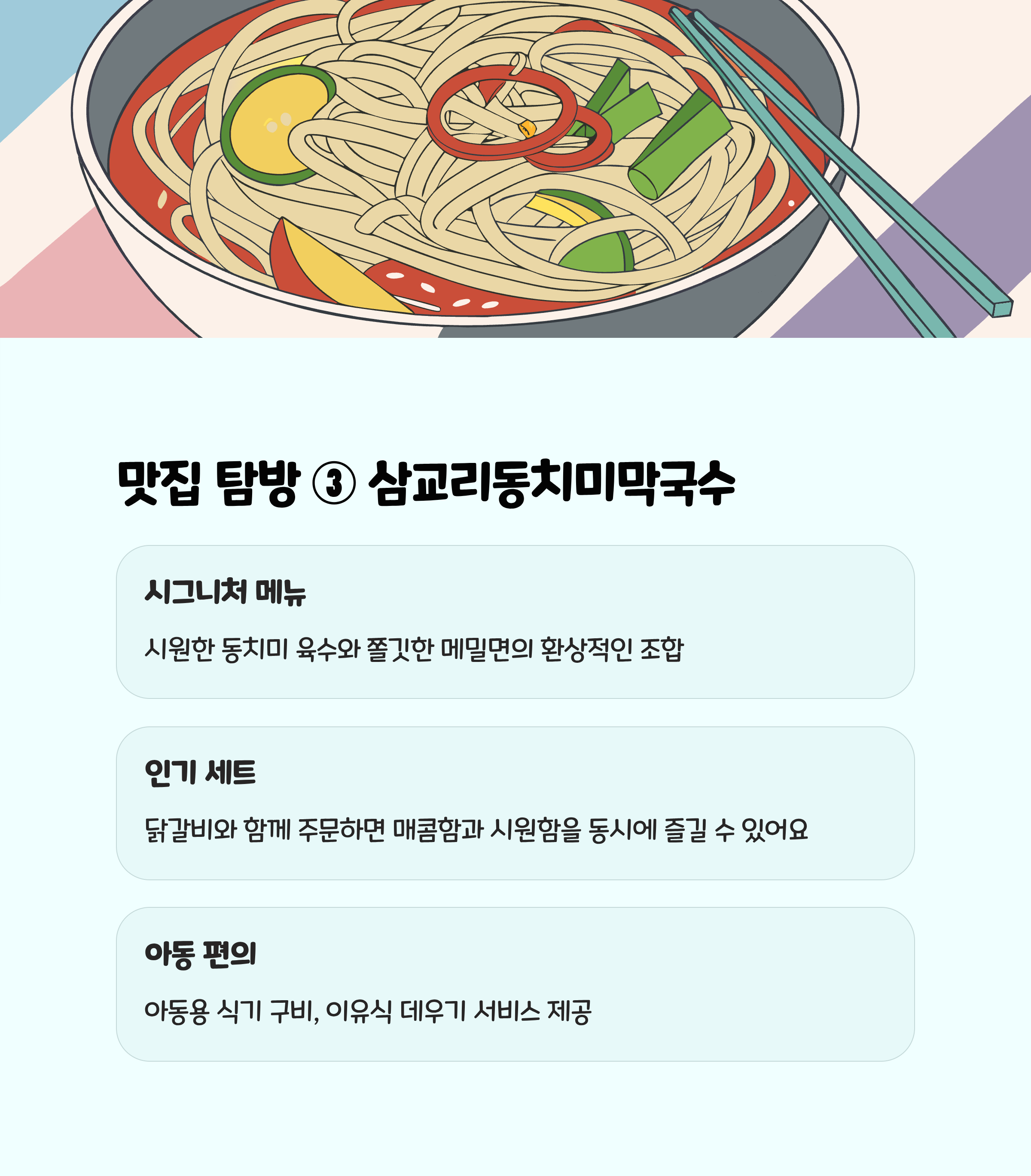 - 오후 늦게(15~16시): 삼교리동치미막국수 등 주변에서 별미 만끽 후 귀가.