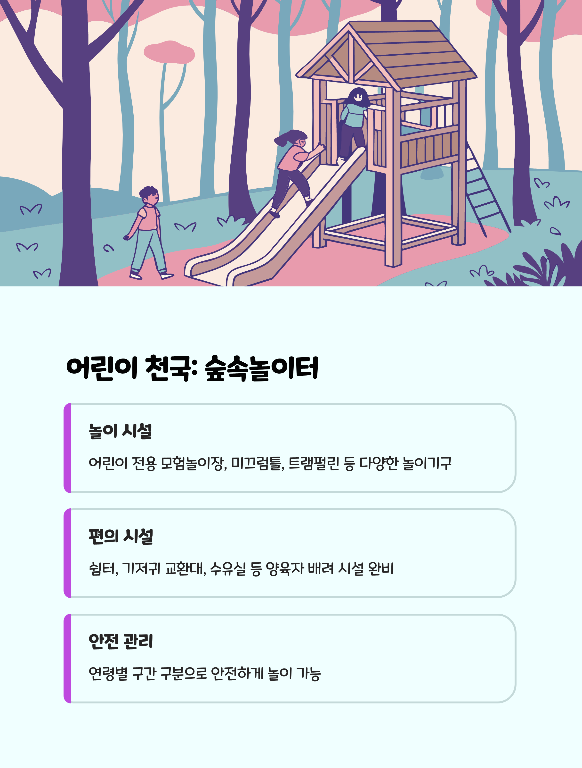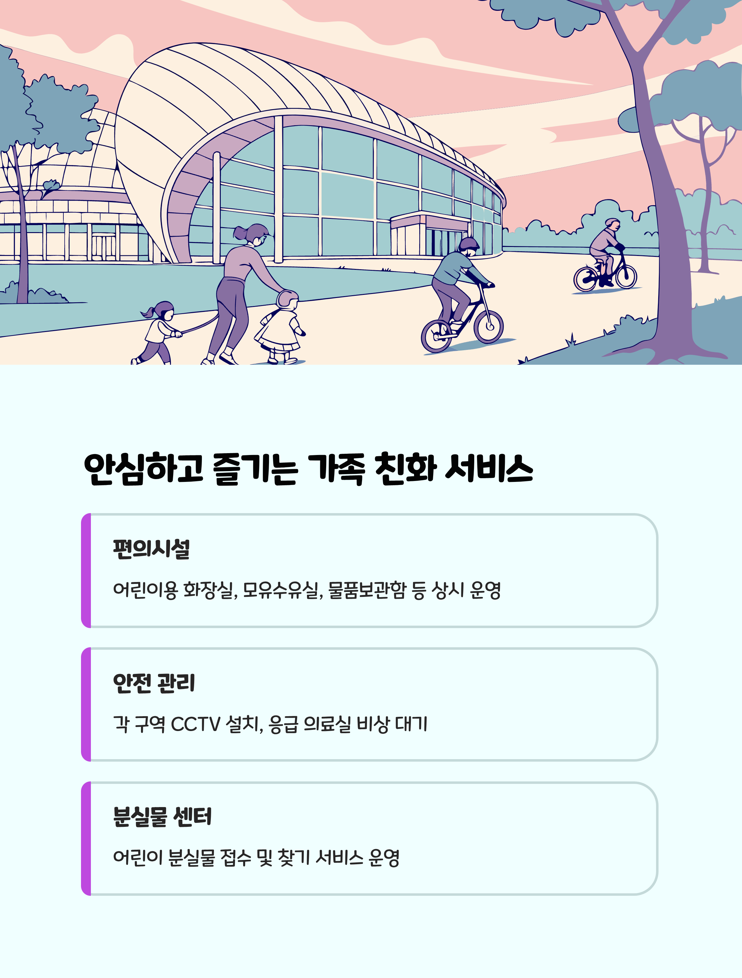 식당 키즈 의자, 어린이용 식기, 유모차 대여 서비스가 잘 갖춰져 있습니다. 놀이터와 작은 동물 체험장도 있어 어린이의 흥미를 유발합니다. 위생과 안전을 고려한 시설 관리가 잘 되어 있어 부모들도 안심하고 이용할 수 있습니다.