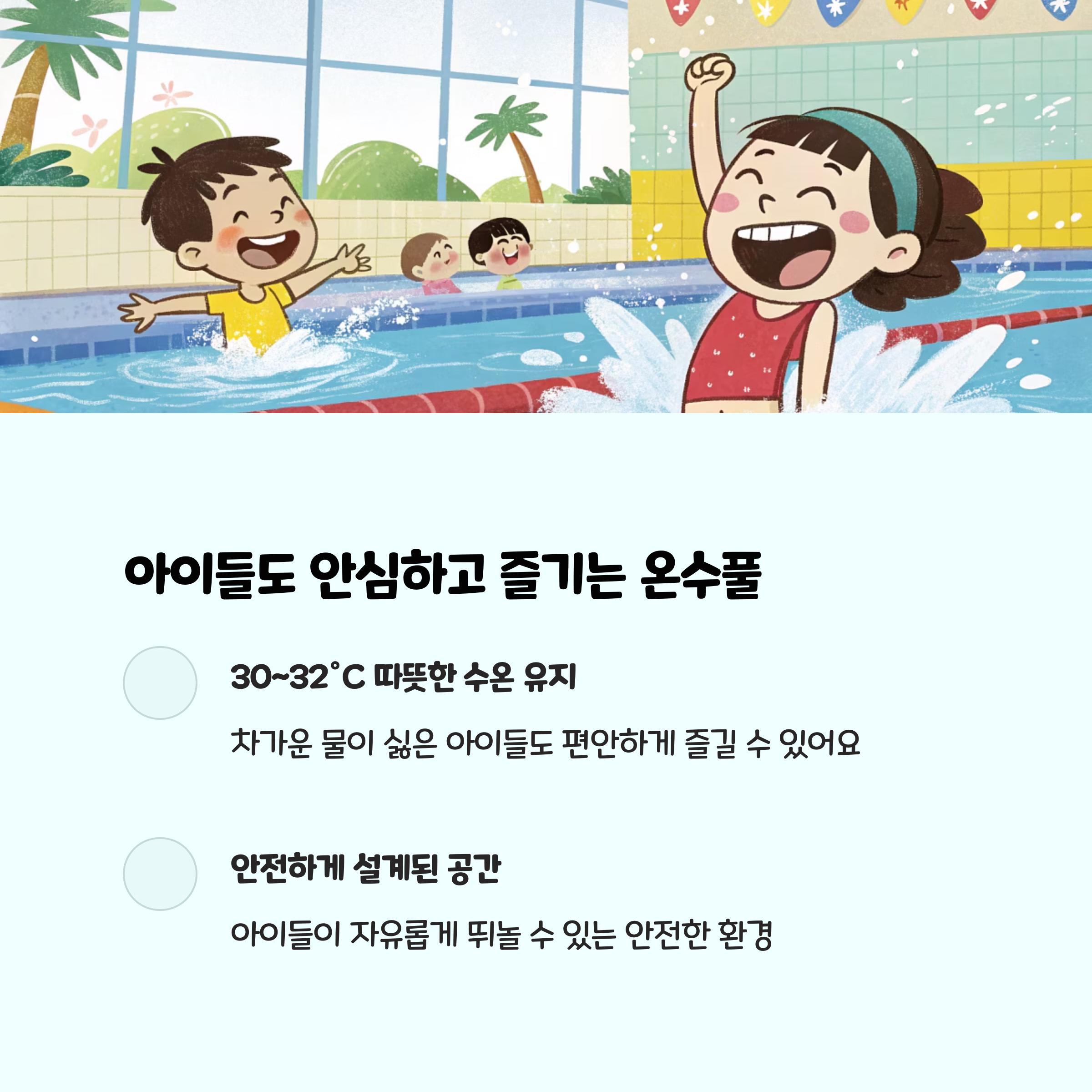워터가든은 온수풀 형태로 운영되어, 아이들이 체온 걱정 없이 안전하게 물놀이를 즐길 수 있습니다. 수심이 낮은 구간과 깊은 구간이 분리되어 있어, 어린 자녀를 둔 가족도 안심하고 이용할 수 있습니다. 성수기에는 입장객이 많으니, 사전 예약으로 편리하게 방문하는 것을 추천합니다.