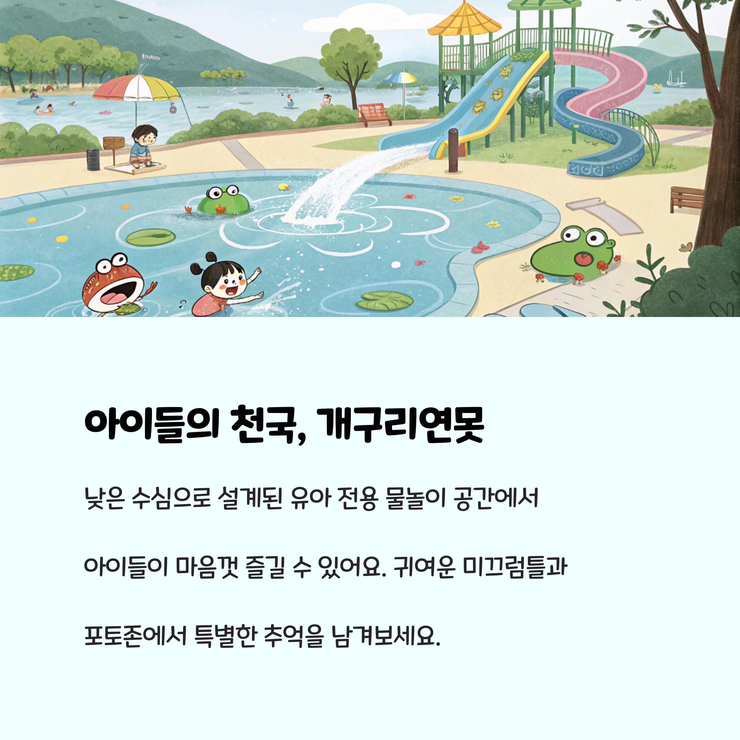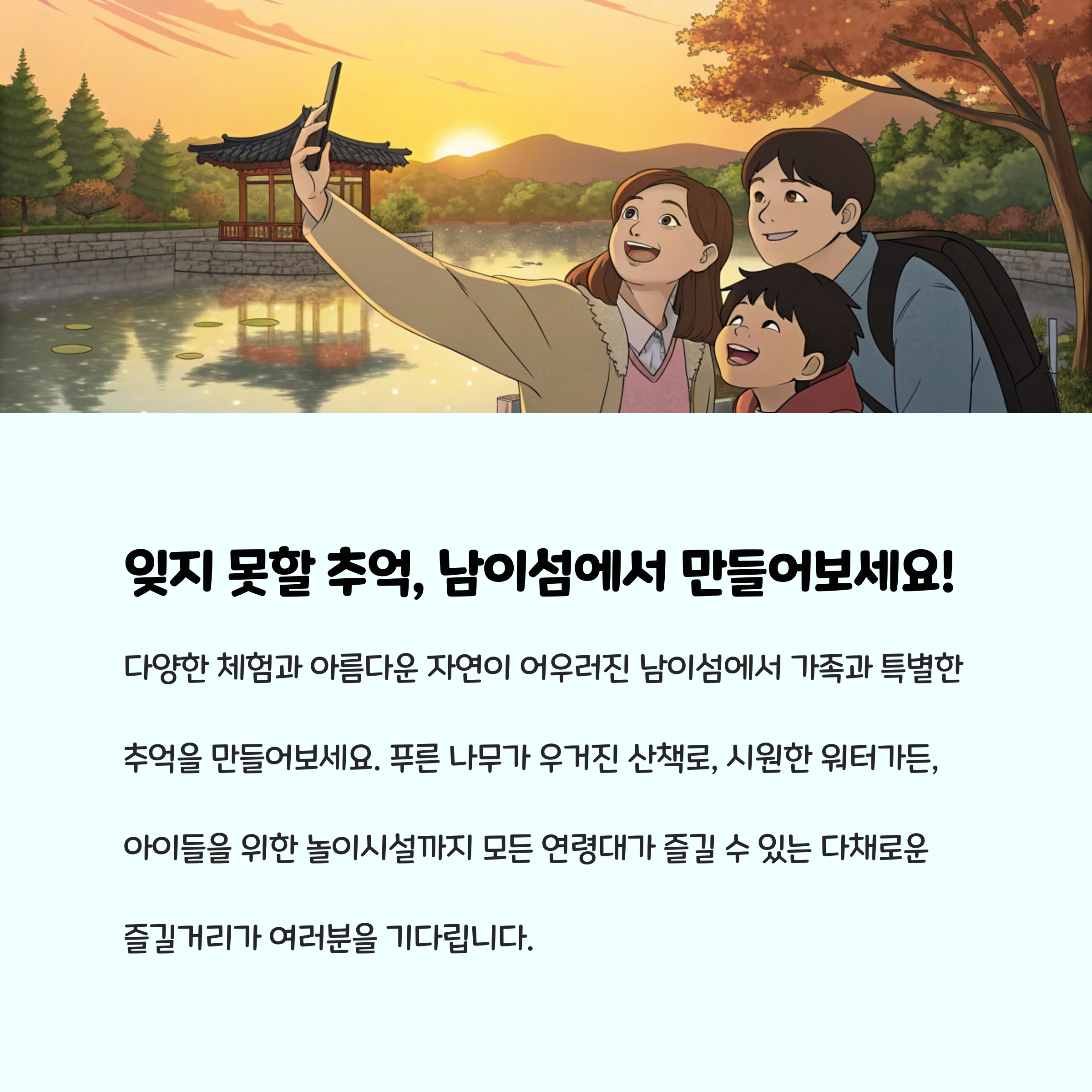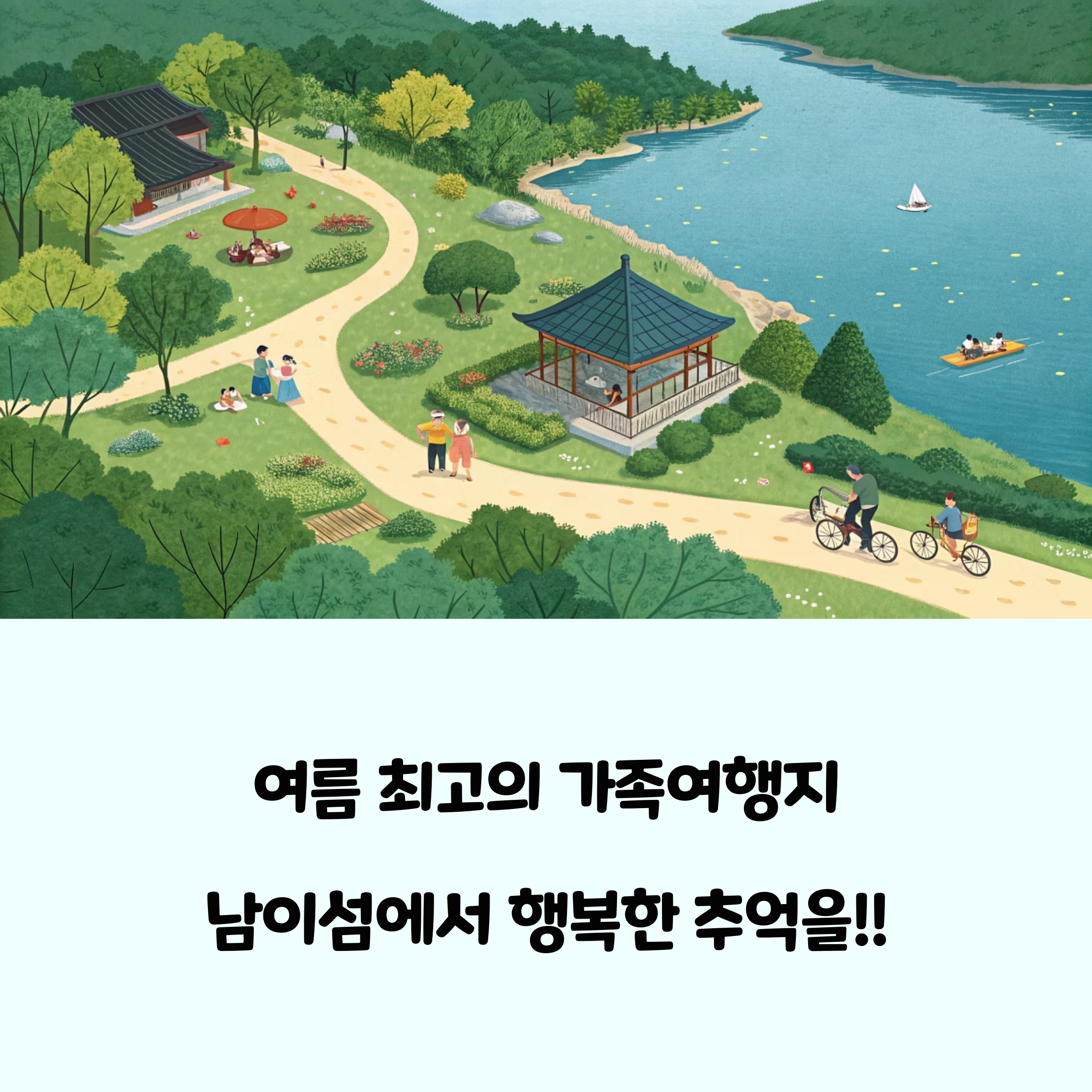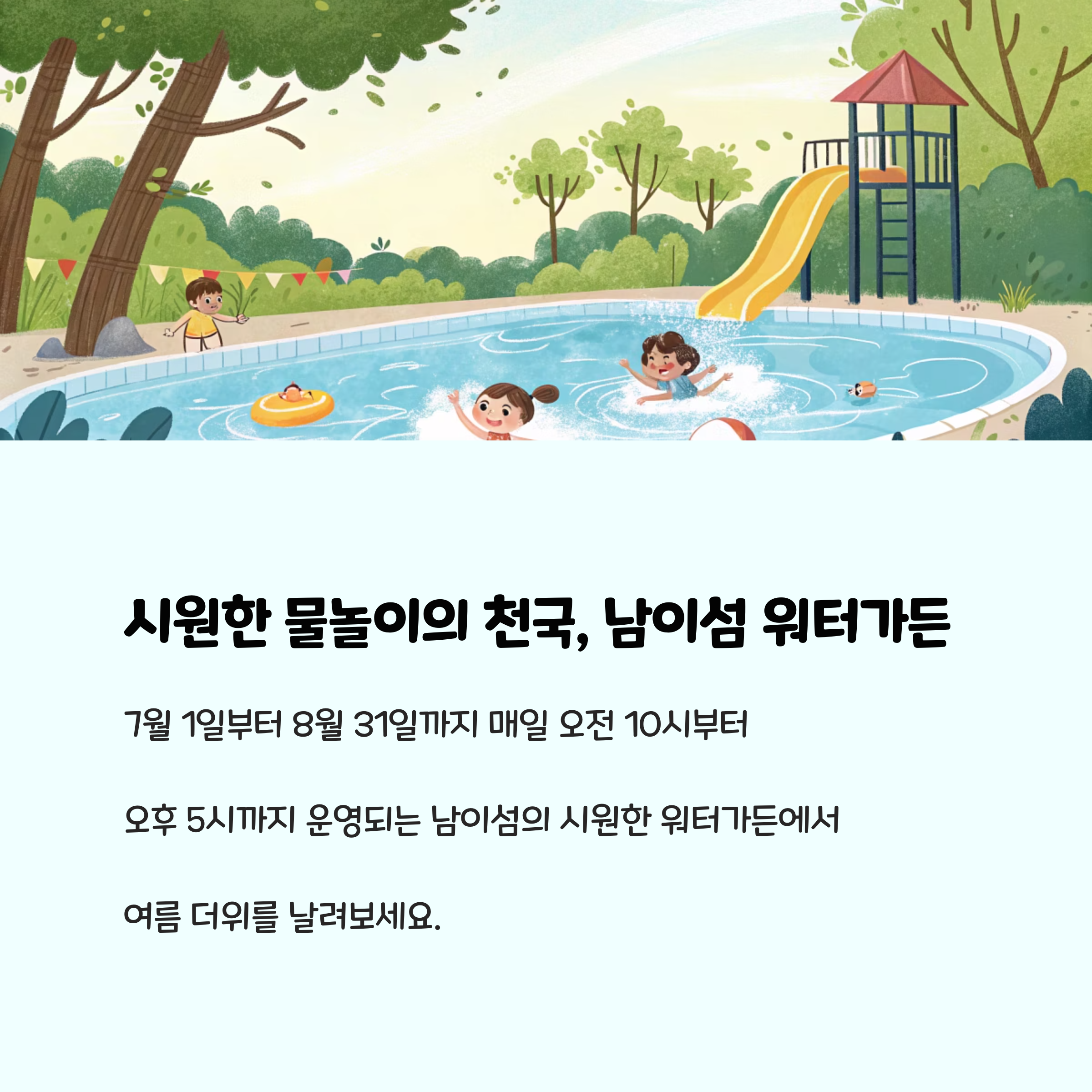 여름 가족여행지로 고민 중이라면, 남이섬에서 시원한 물놀이와 자연 체험, 그리고 아이만을 위한 특별한 공간까지 모두 경험해 보세요. 올해 여름, 남이섬은 가족 모두에게 잊지 못할 추억을 선물할 최고의 여행지가 될 것입니다.
