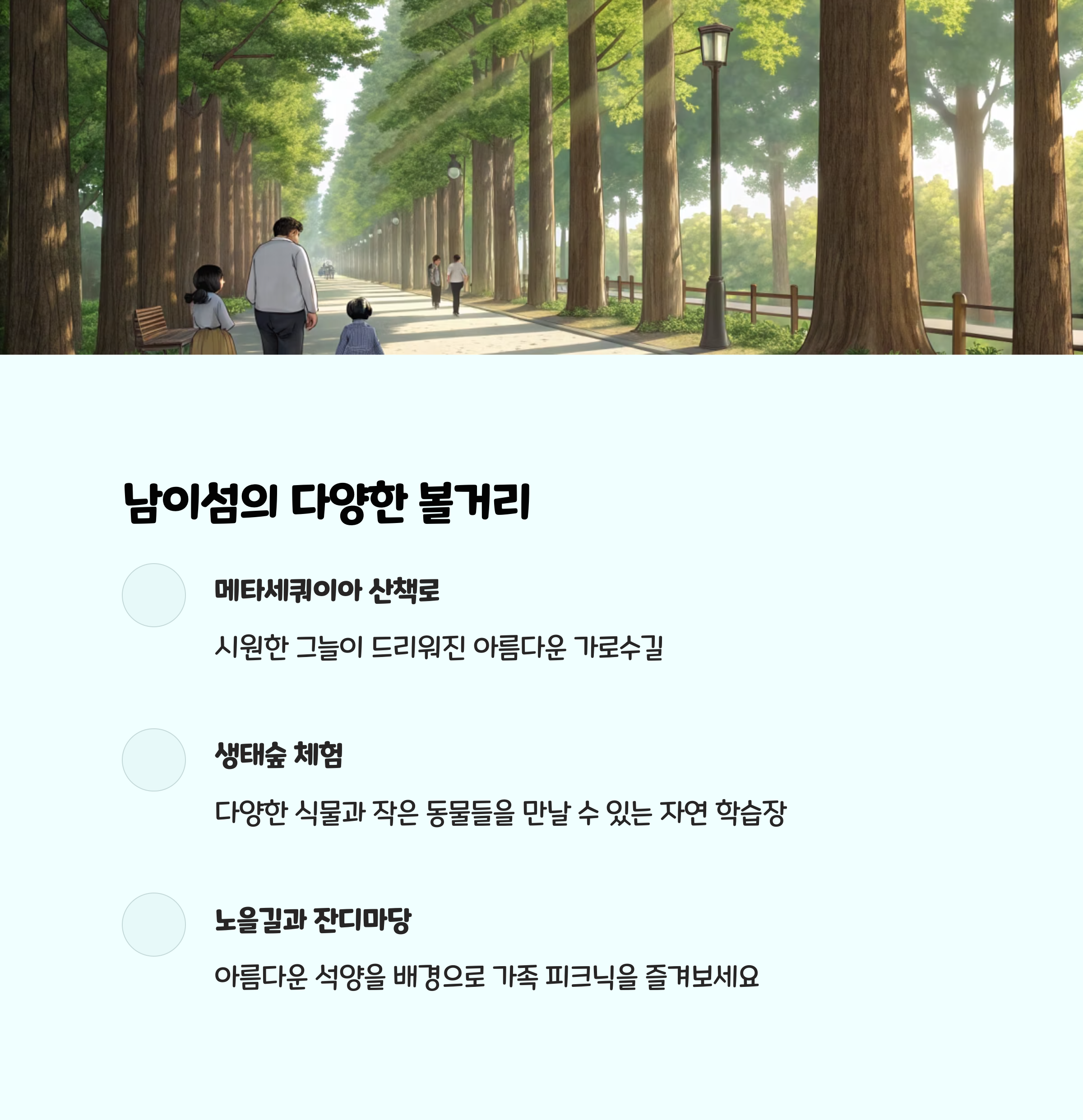 - 남이섬은 접근성도 좋아, 서울·경기권에서 당일치기 또는 1박 2일 코스로도 충분히 다녀올 수 있습니다.