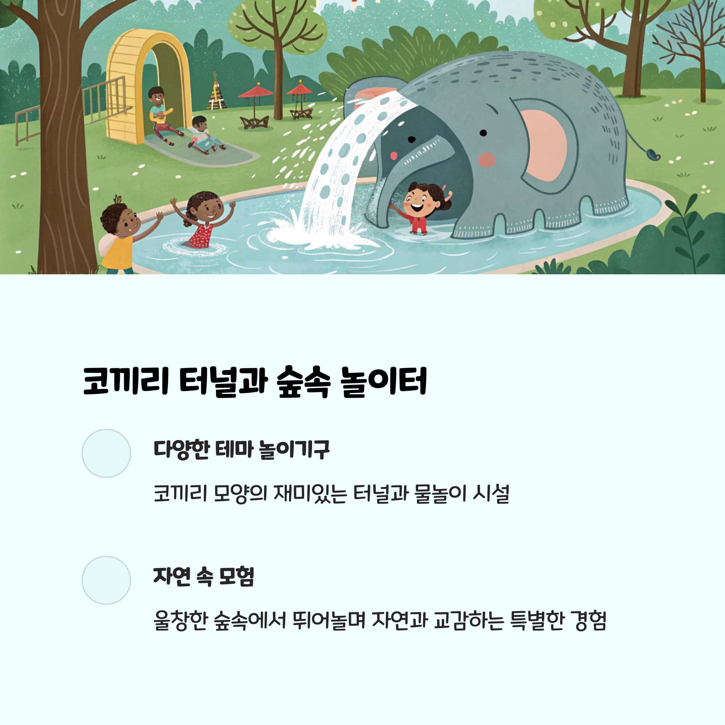 개구리연못 & 코끼리 터널: 남이섬 중앙에 위치한 개구리연못은 아이들이 자유롭게 뛰놀 수 있는 공간입니다. 연못 맞은편에는 터널과 언덕이 어우러진 코끼리 터널이 있어, 아이들이 경주를 하며 신나게 놀 수 있습니다.유니세프 라운지: 남이섬이 아시아 최초의 어린이친화공원으로 지정된 기념 공간으로, 아이와 함께 다양한 도서를 읽고 체험할 수 있는 작은 도서관이 마련되어 있습니다.숲 속 놀이터: 자연 속에서 뛰놀며 모험심을 키울 수 있는 공간으로, 그늘이 많아 한여름에도 쾌적하게 이용할 수 있습니다.