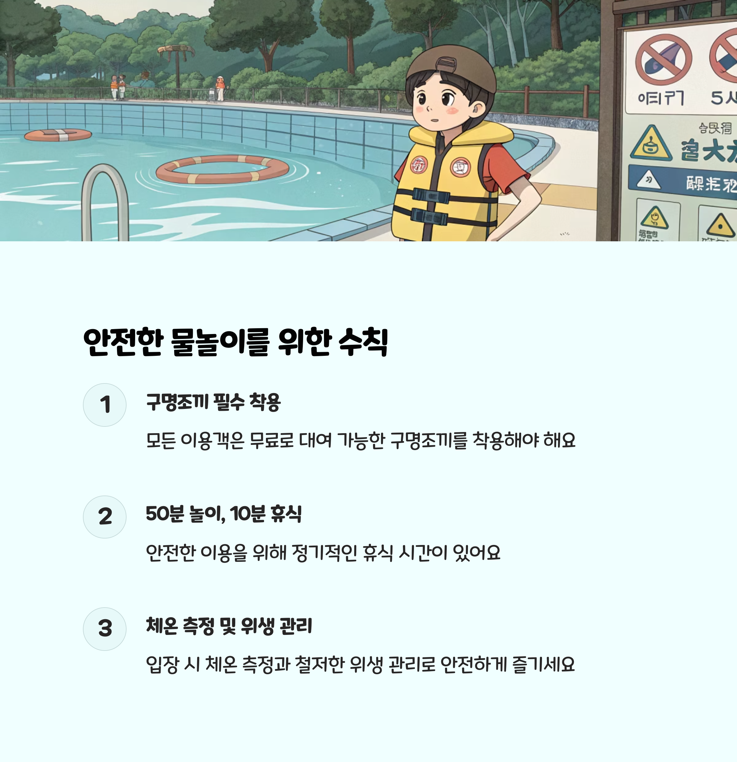 구명조끼 착용 필수: 어린이는 반드시 구명조끼를 착용하세요.자외선 차단제 챙기기: 야외 활동이 많으니 자외선 차단제를 꼭 바르세요.사전 예약 활용: 워터가든 등 인기 시설은 사전 예약이 필수입니다.휴대용 텐트, 돗자리 준비: 피크닉을 계획한다면 휴대용 텐트나 돗자리를 챙기면 더욱 편리합니다.