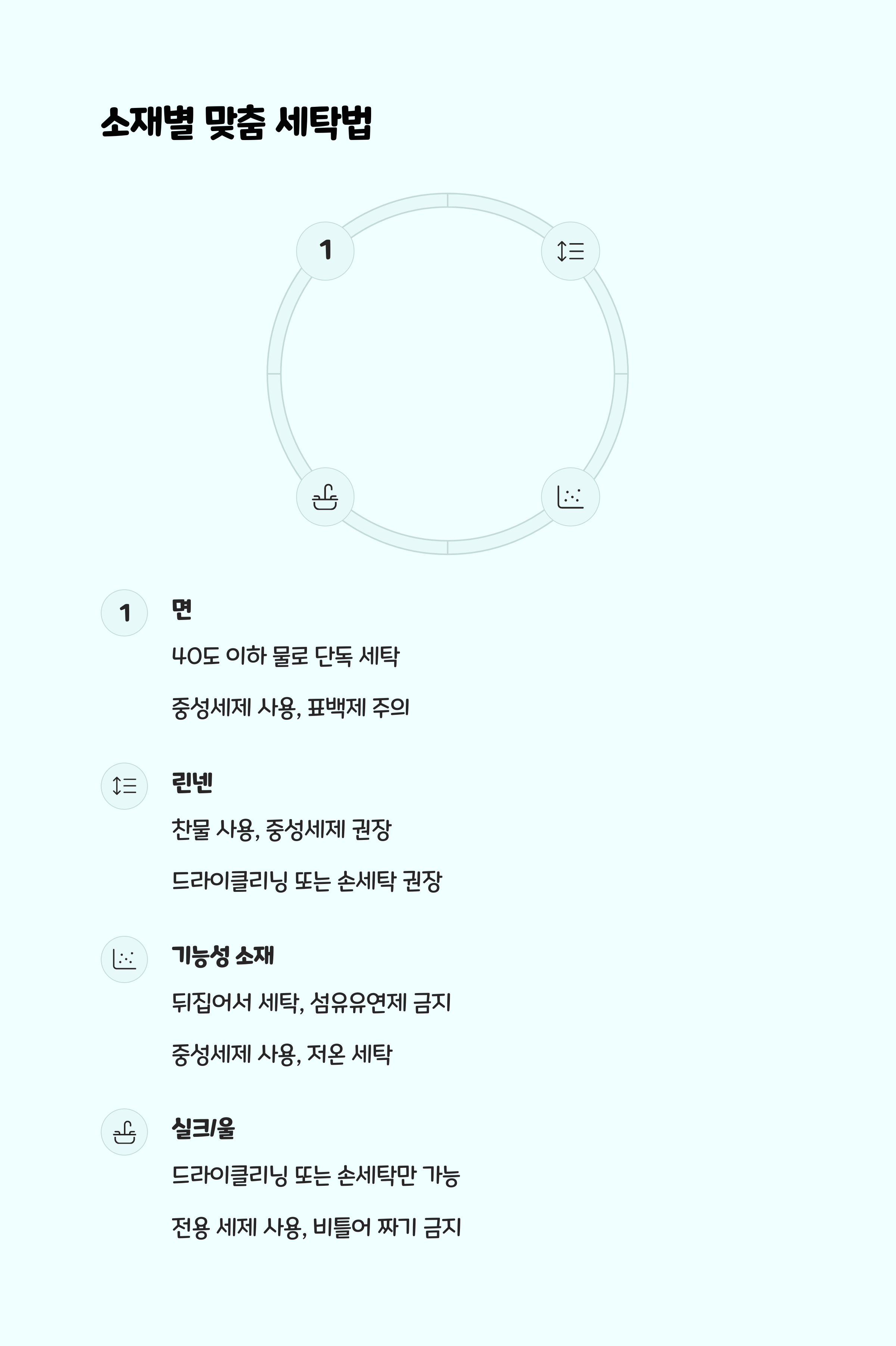• 린넨 : 30도 이하 물에 중성세제로 손세탁이 가장 좋습니다. 세탁기를 쓸 땐 세탁망을 사용하고, 섬유유연제는 피하세요. 건조는 직사광선을 피해 그늘에서 해주세요.