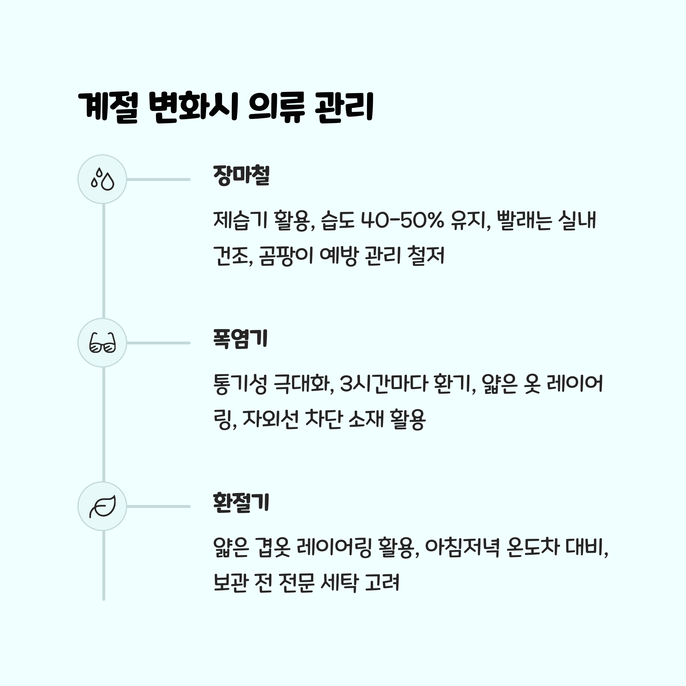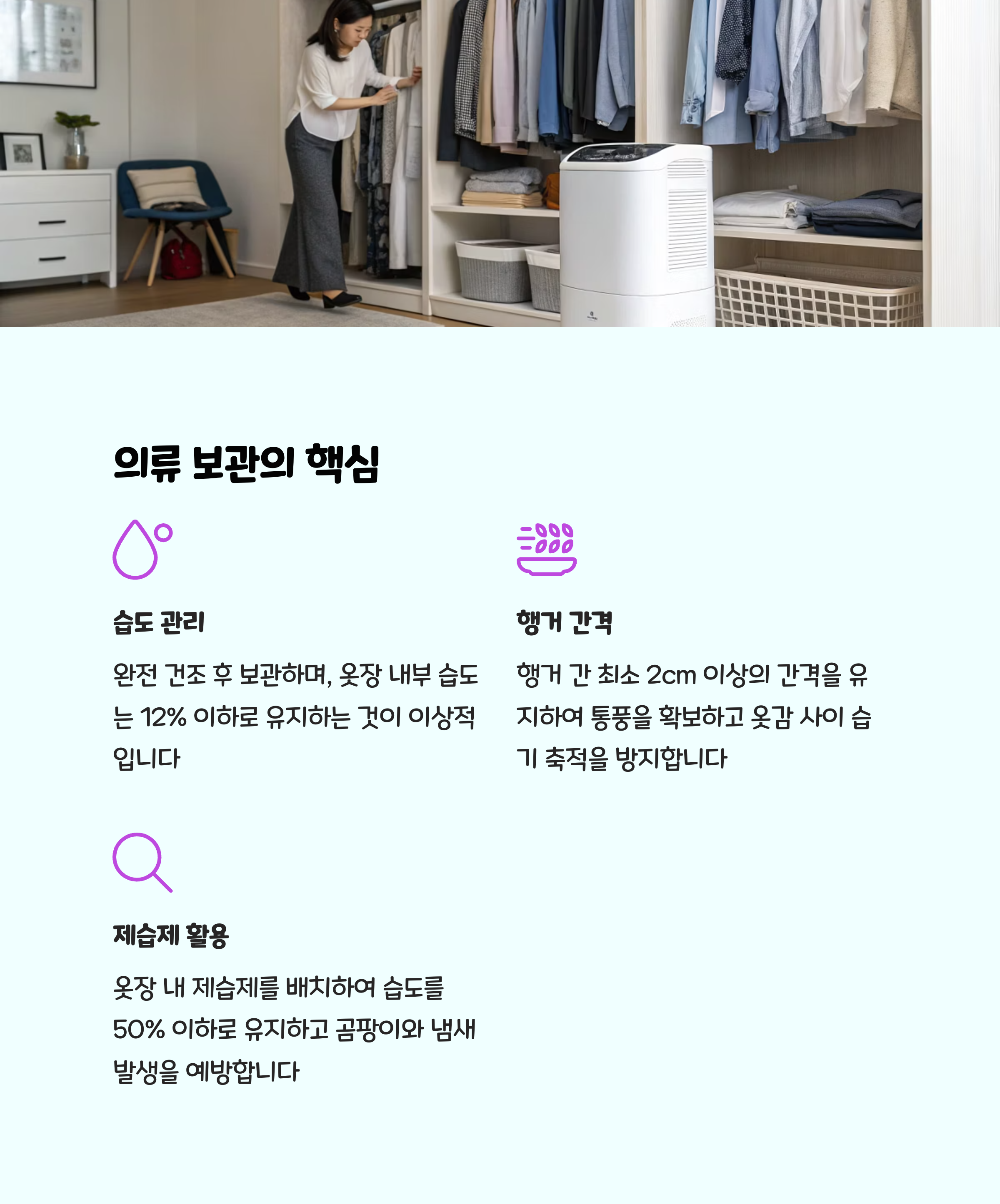 옷은 완전히 건조시킨 후 보관해야 곰팡이나 냄새 발생을 막을 수 있습니다. 장마철에는 제습제나 방습제를 함께 넣어 보관하면 습기와 냄새를 효과적으로 예방할 수 있습니다.