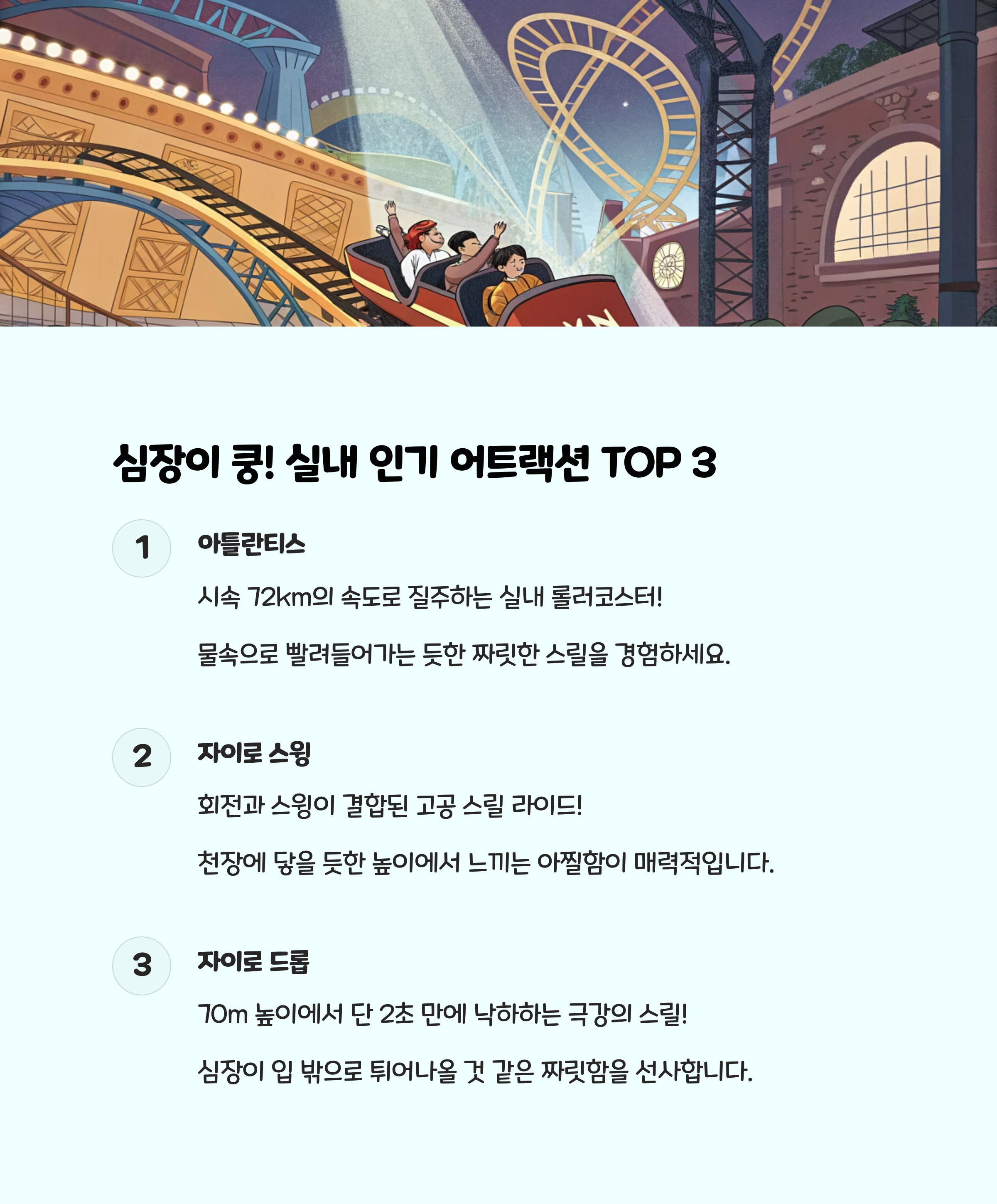 후룸라이드: 실내에서 경험하는 급류 탐험 어트랙션신밧드의 모험: 모션 기반의 전통 인기 어트랙션혜성특급: 실내 롤러코스터로 짜릿한 속도를 자랑드래곤 와일드 슈팅: 온 가족이 함께하는 슈팅 어트랙션