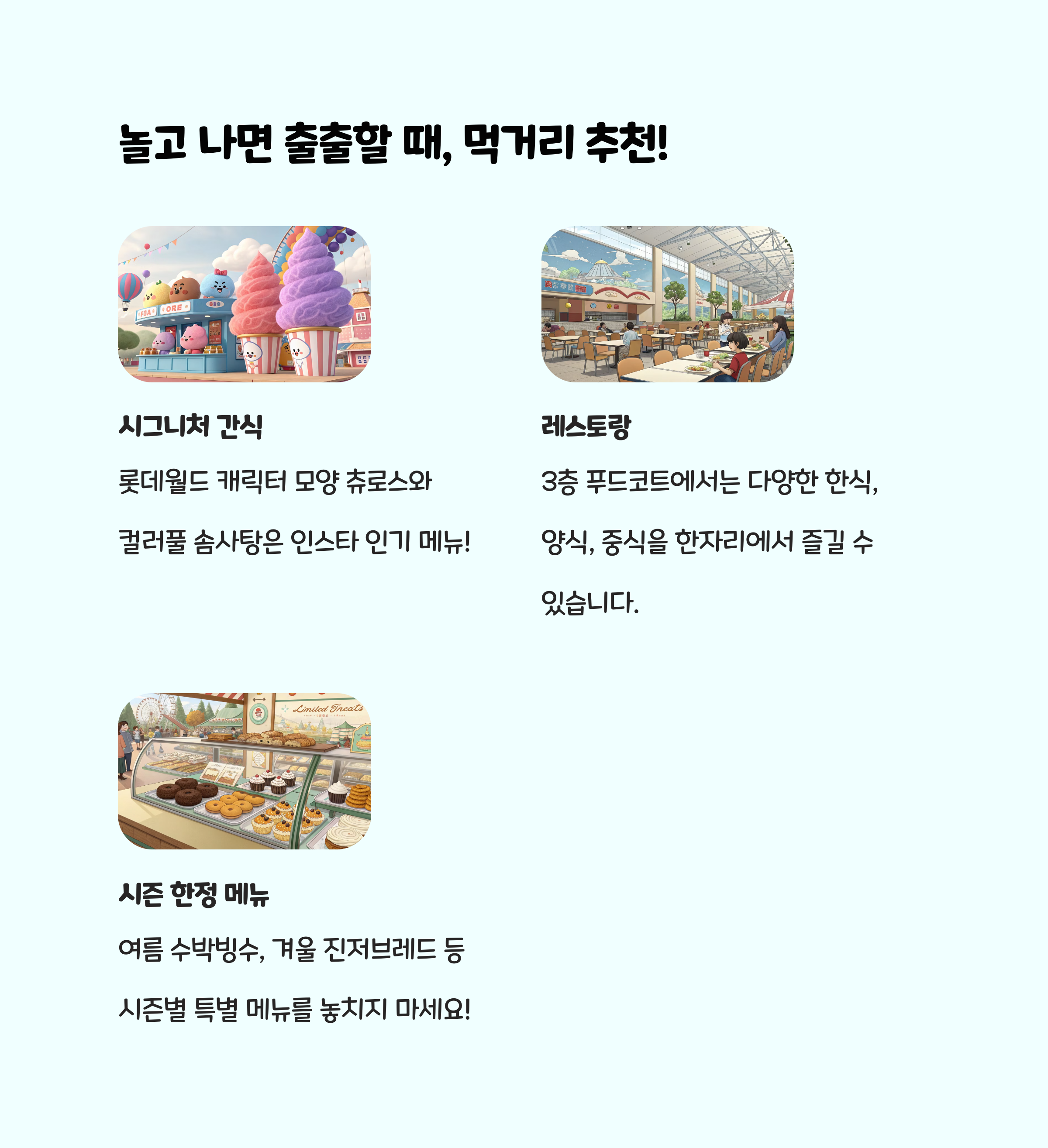 하루 종일 테마파크를 돌아다니다 보면 중간중간 휴식과 식사가 필요합니다. 실내 어드벤처존에는 푸드코트, 카페, 테마 레스토랑이 다양하게 마련되어 있어, 한식·양식·디저트까지 취향에 따라 선택할 수 있습니다. 인기 매장에는 점심시간 대기줄이 길어질 수 있으니, 11시~12시 사이 미리 식사하는 것이 좋습니다.