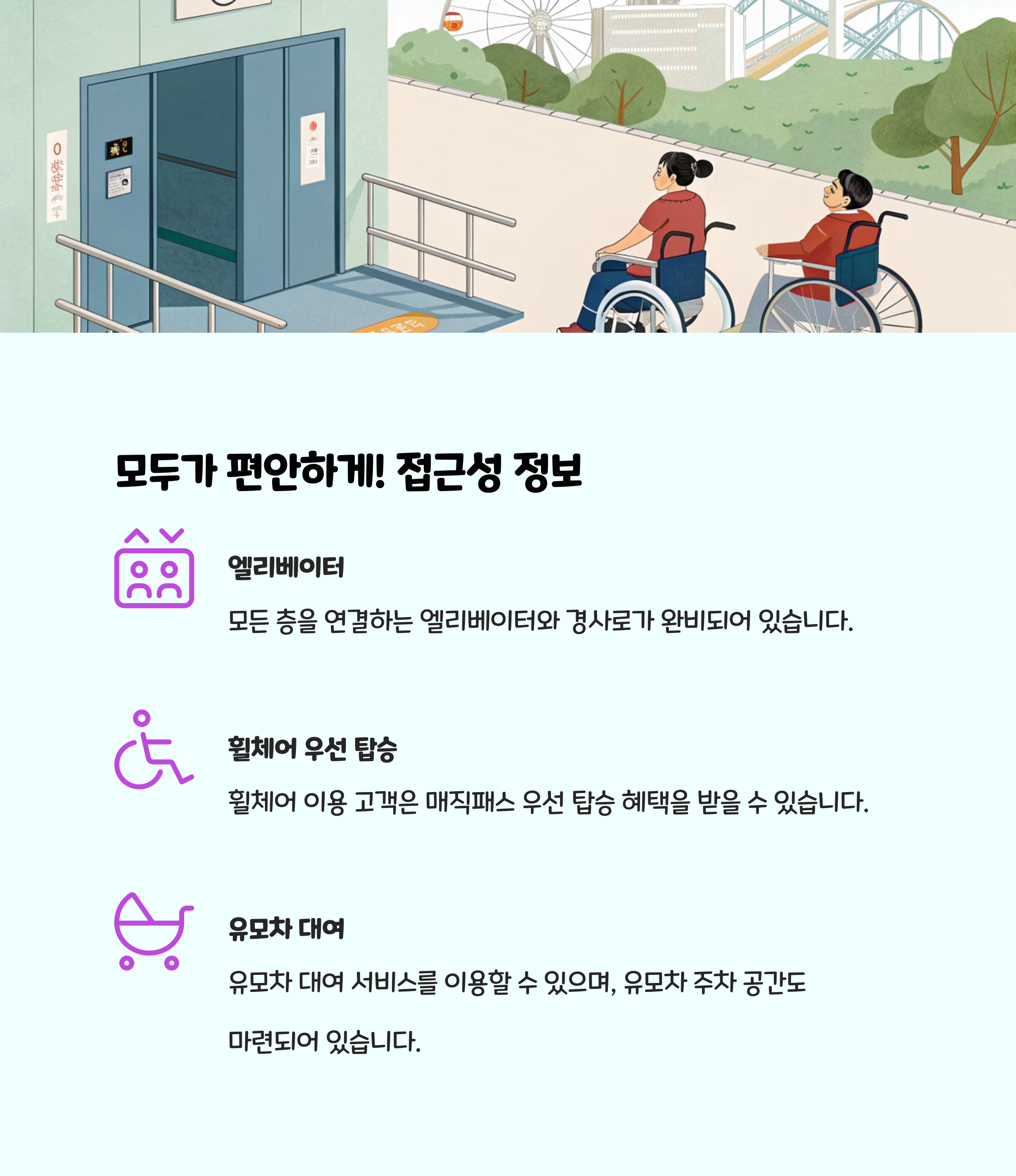 오전에는 대기 시간이 짧은 실외 어트랙션을 먼저, 오후에는 실내 어드벤처존을 집중 공략하는 동선이 효율적입니다.