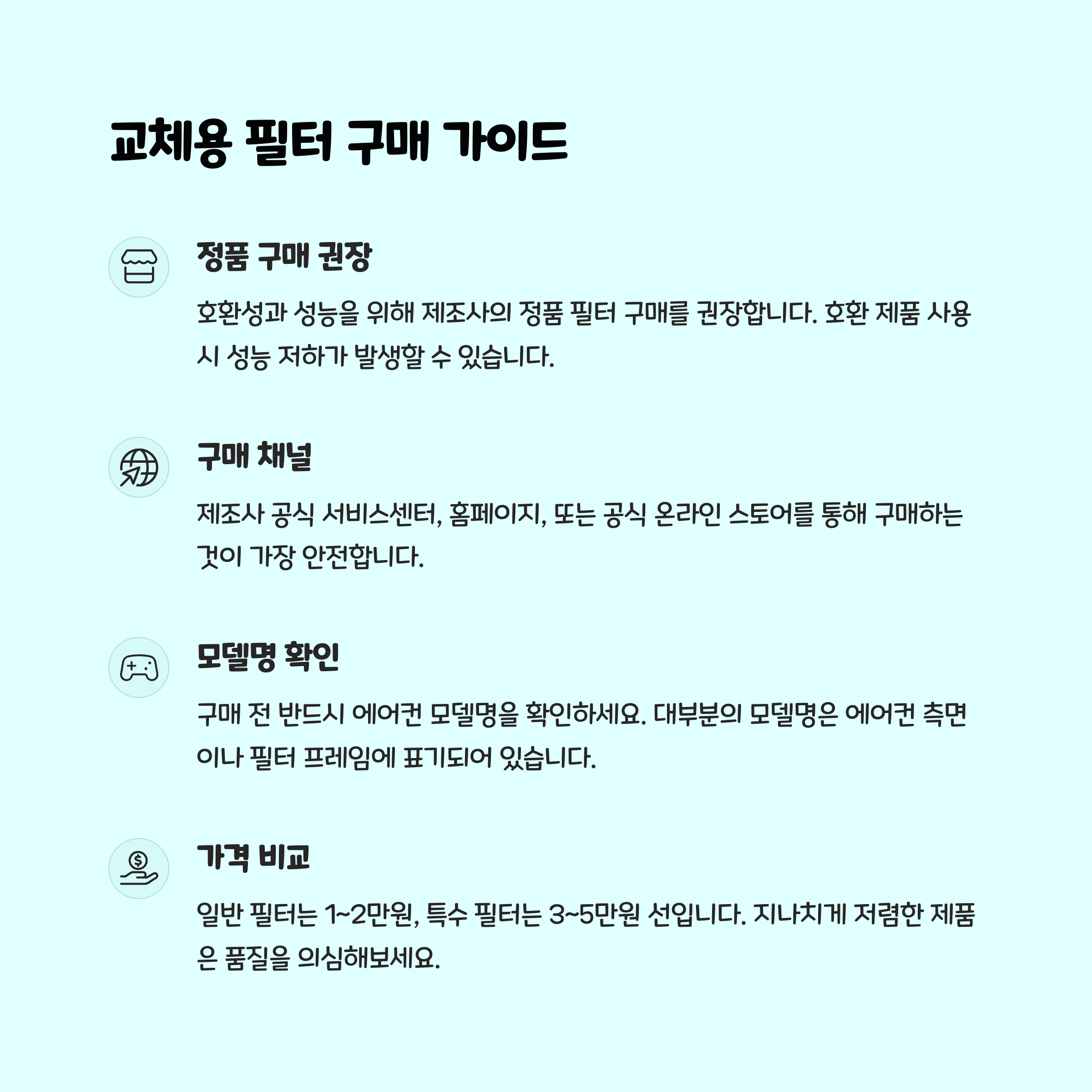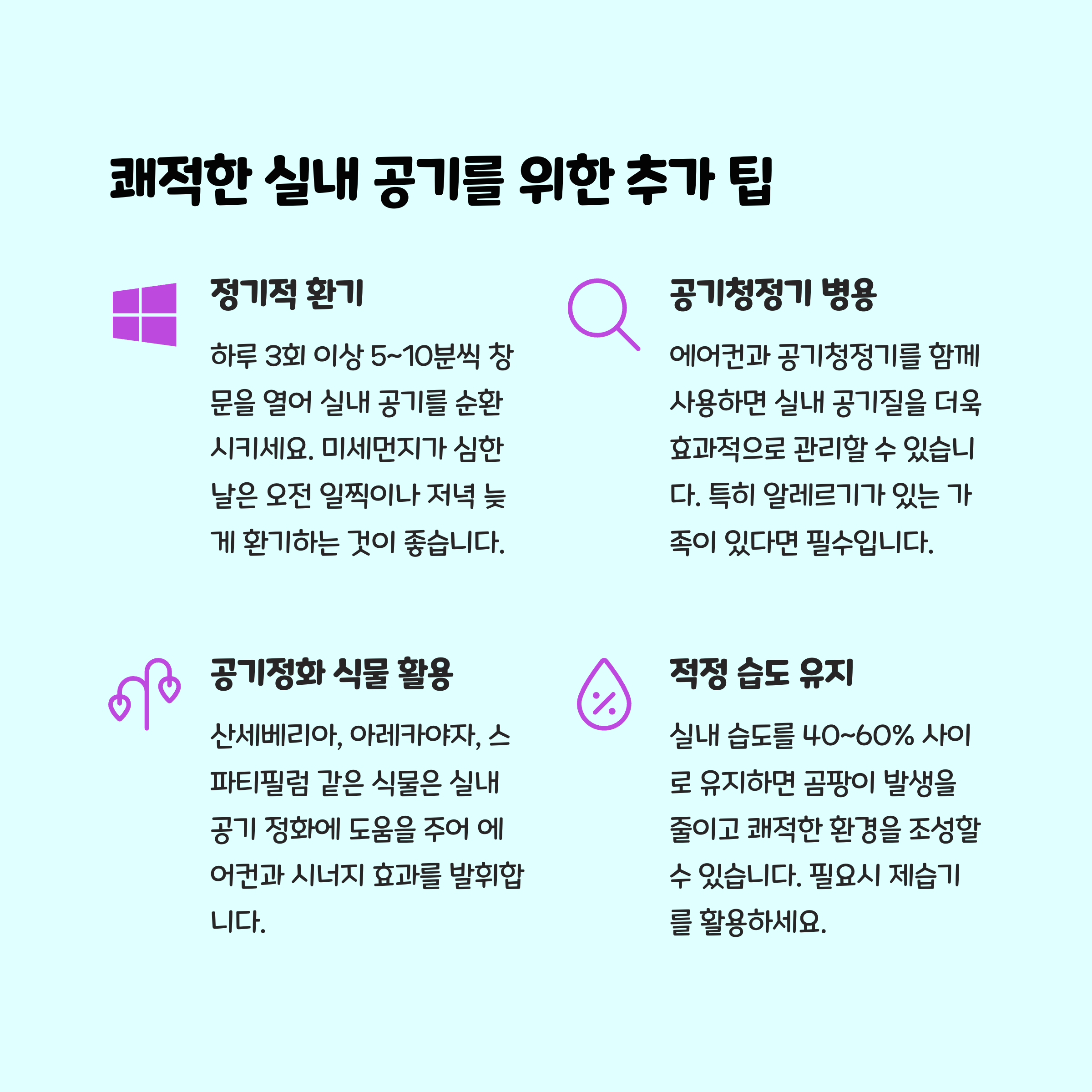 - 정기 점검 : 여름철 사용 전에 미리 필터를 점검하고 청소하면 냉방 효과를 극대화할 수 있습니다.