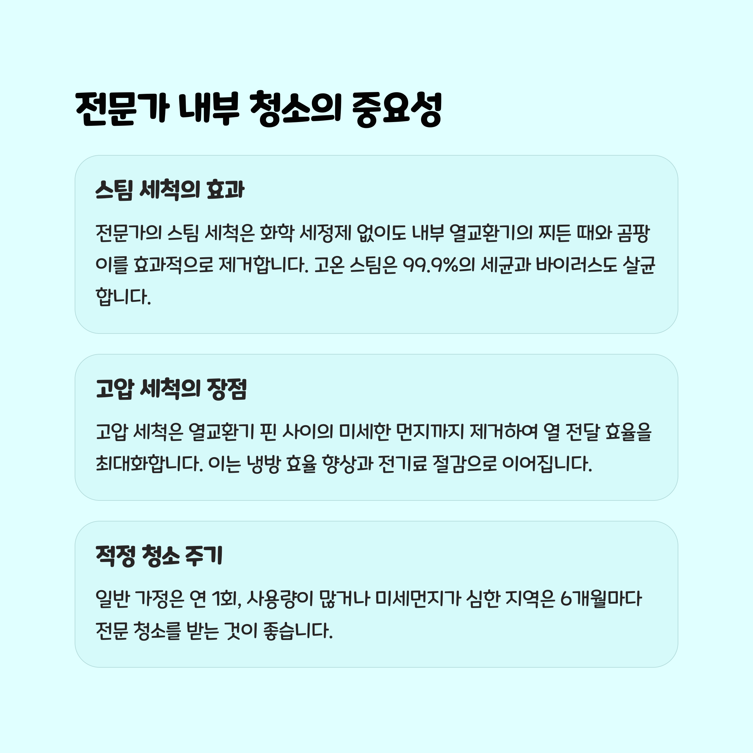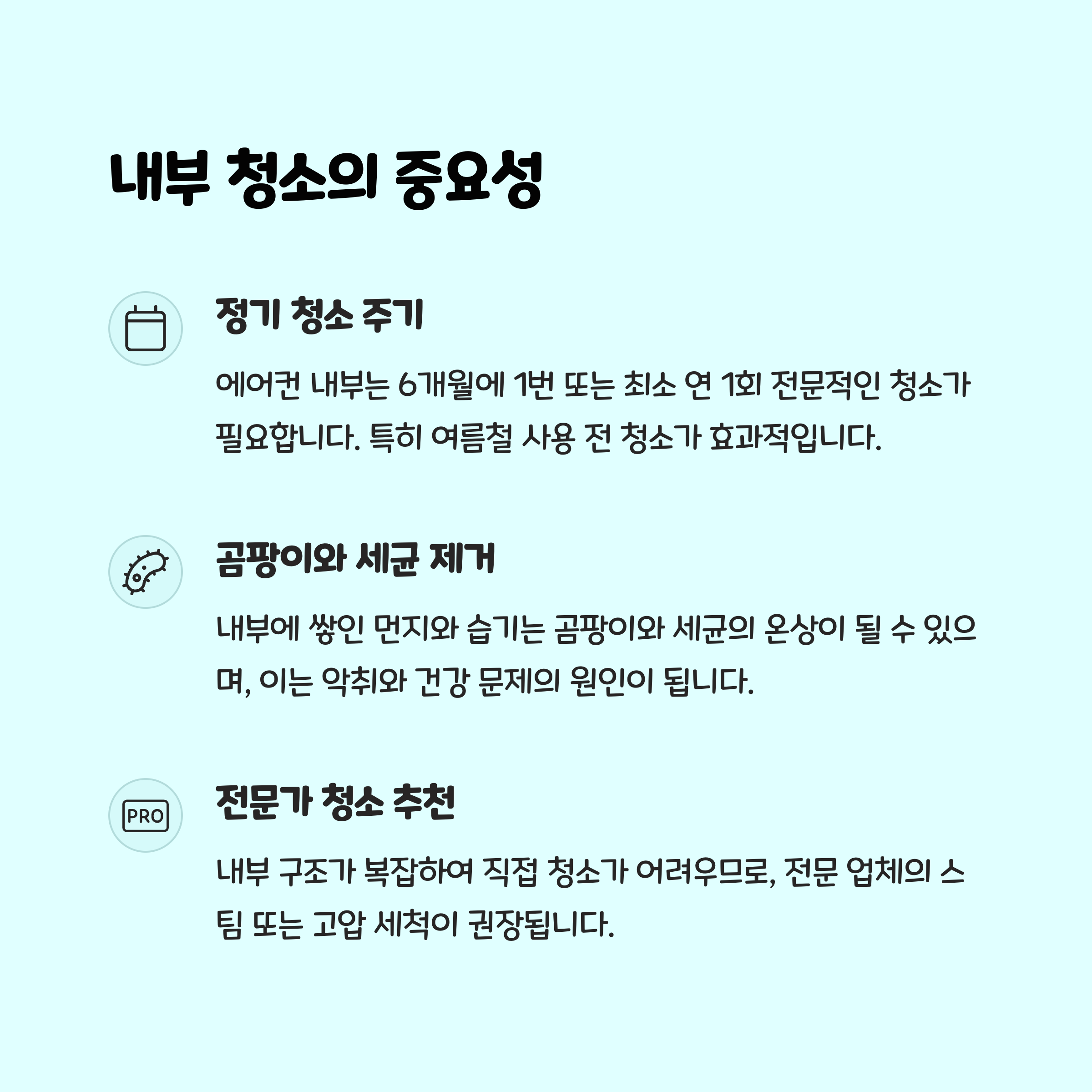 - 내부 청소 주기 : 내부 청소는 연 1회가 기본이며, 필요에 따라 6개월에 한 번 전문가 청소를 고려할 수 있습니다.