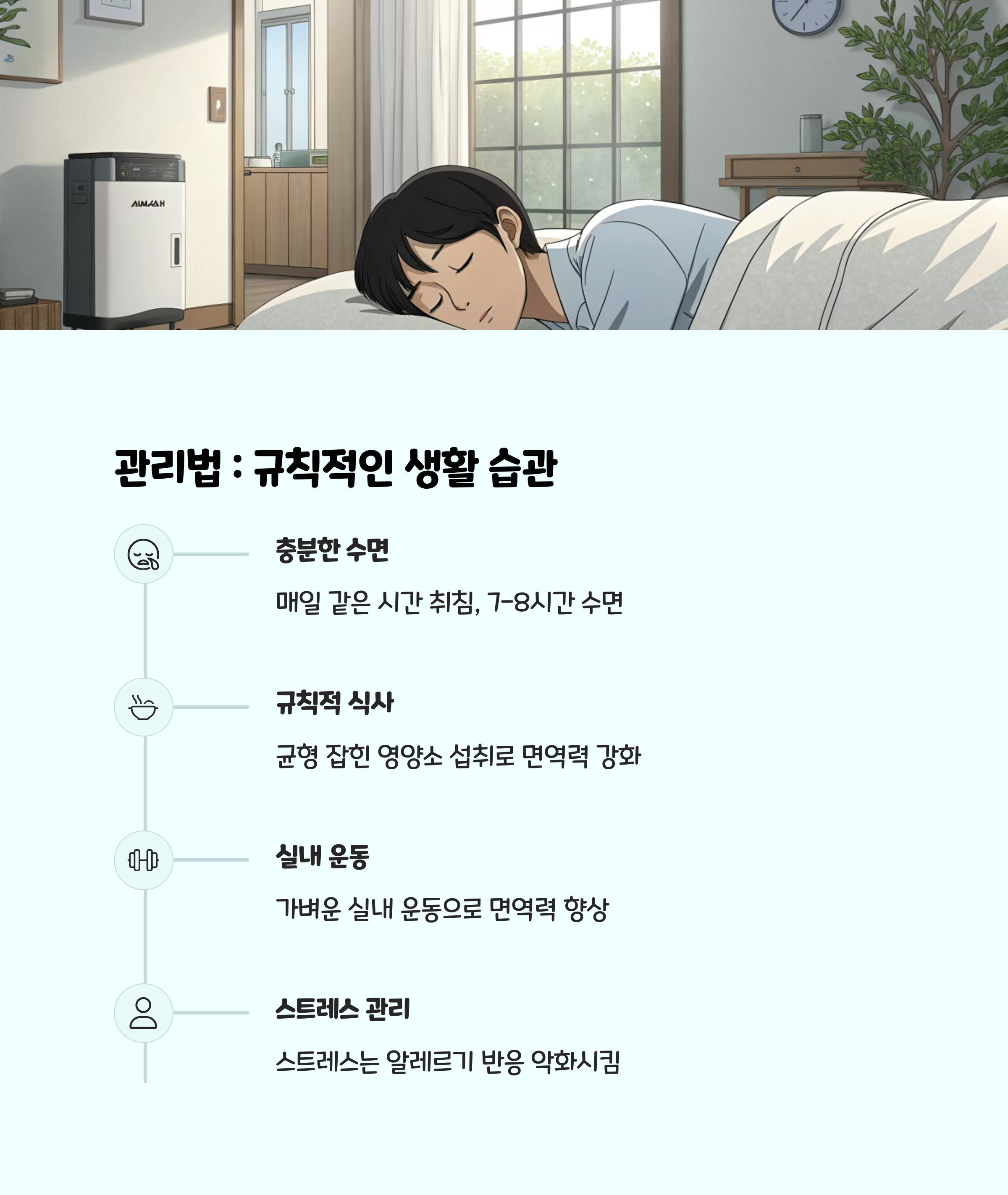 • 하루 7~8시간 규칙적인 수면, 균형 잡힌 식사, 가벼운 유산소 운동(걷기, 줄넘기 등)을 꾸준히 실천하세요.