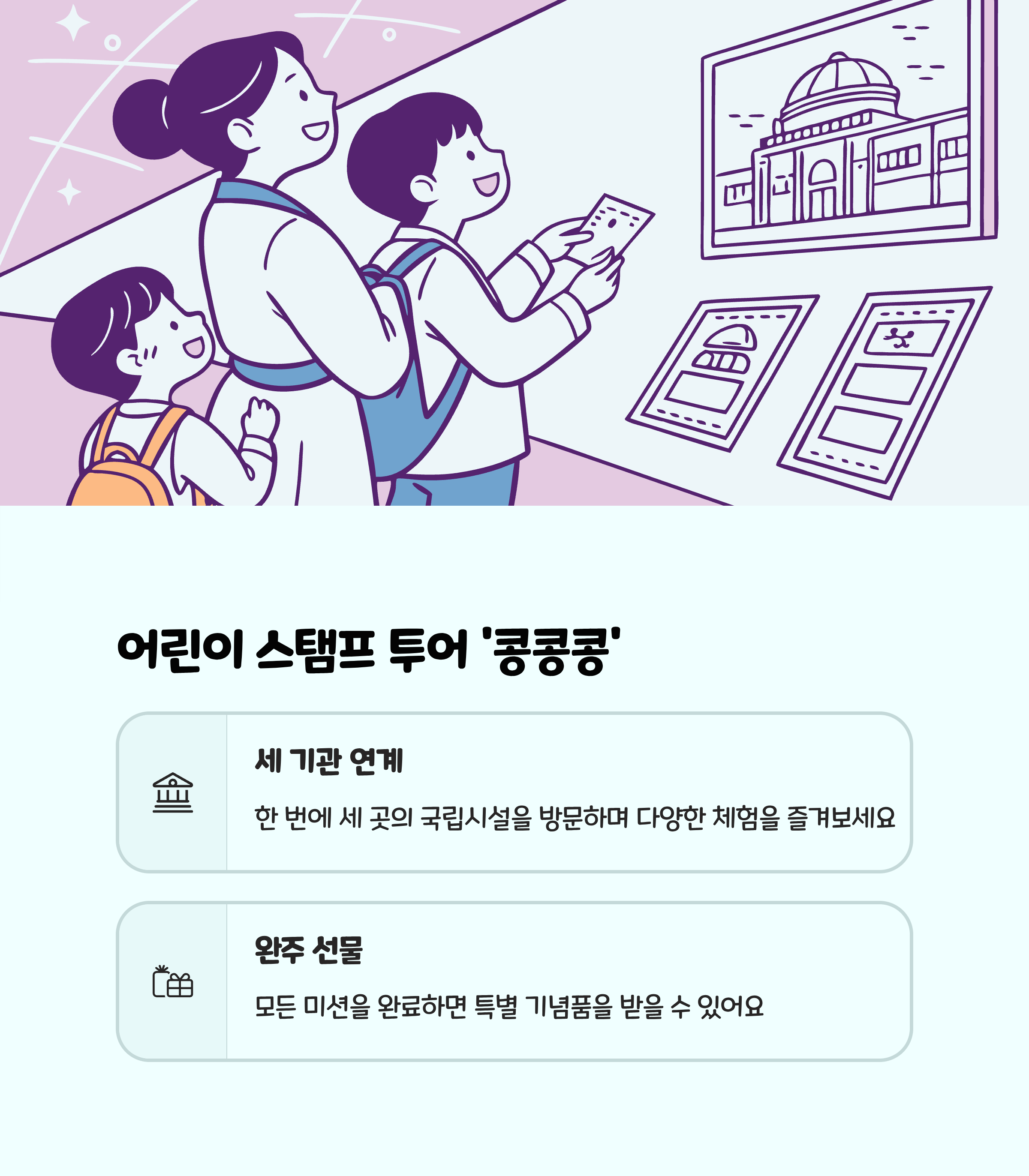‘콩콩콩’ 스탬프 투어는 국립해양박물관, 국립부산과학관, 국회부산도서관 3개 기관에서 운영하며, 미션별 스탬프를 모으면 기념품을 받을 수 있습니다. 미취학 아동부터 초등학생까지 가족과 함께 참여 가능하며, 7월부터 10월까지 진행됩니다. 현장 방문 후 스탬프북을 받고 투어를 즐길 수 있습니다.