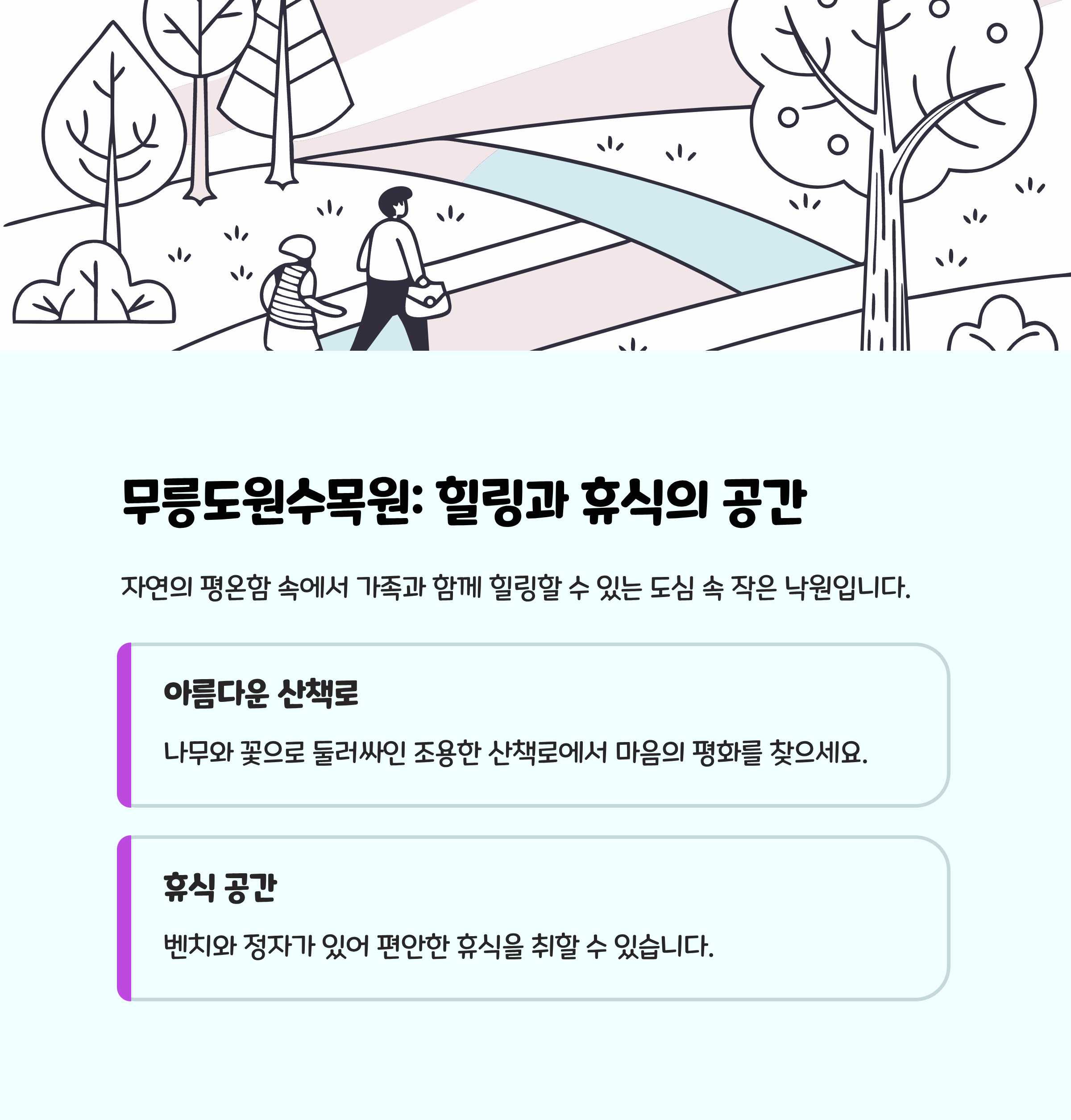 무릉도원수목원은 2012년에 조성된 도시형 수목원으로, 현실과 이상 세계를 테마로 한 다양한 식물과 자연 풍경을 만날 수 있습니다. 생태연못, 암석원, 약용식물원, 명상원 등 다양한 구역에서 자연을 느끼며 산책과 체험이 가능해 아이들과 어른 모두에게 힐링 공간입니다.